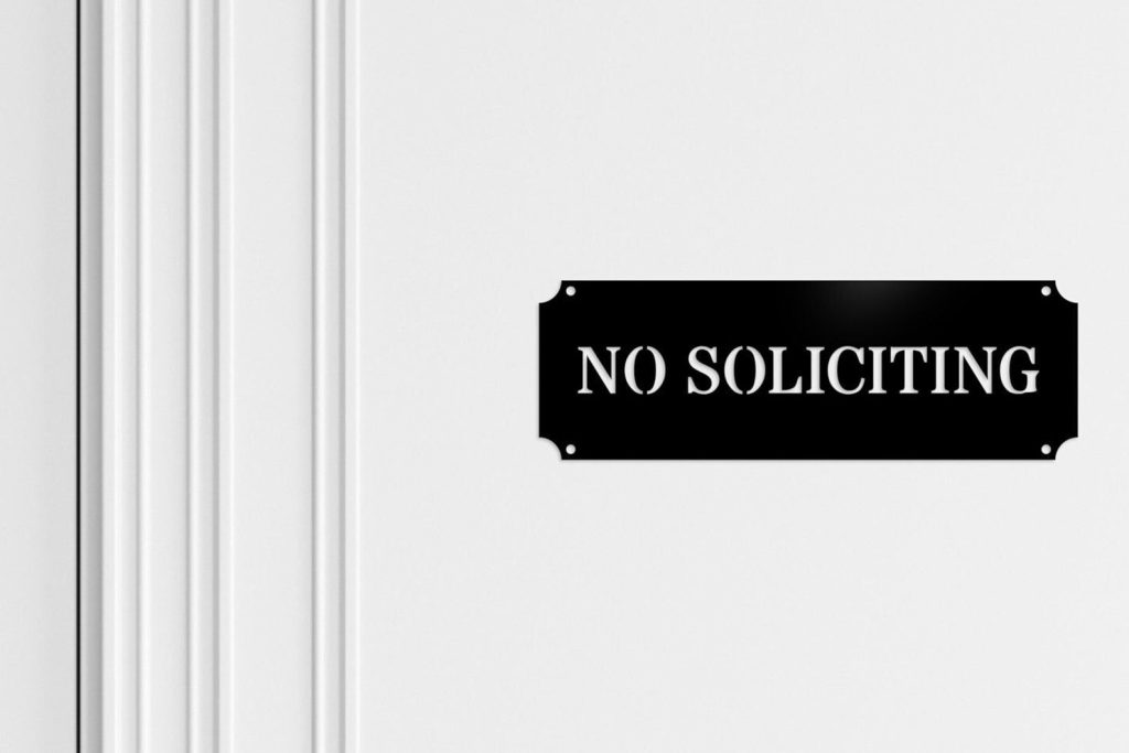 Keep pesky salesmen away with this custom metal sign! This No Soliciting Sign makes a great door hanger or wall hanger, and comes with pre-cut holes for easy mounting.