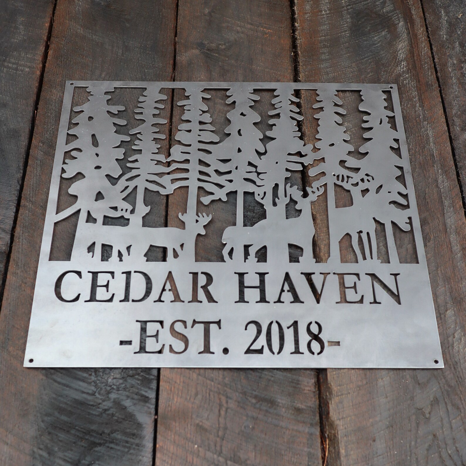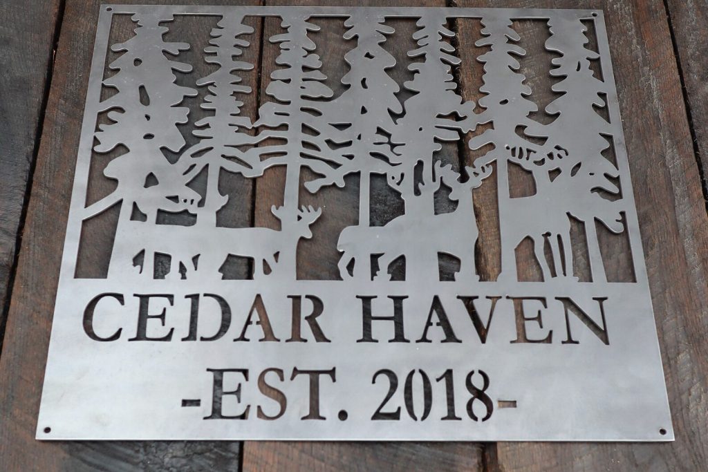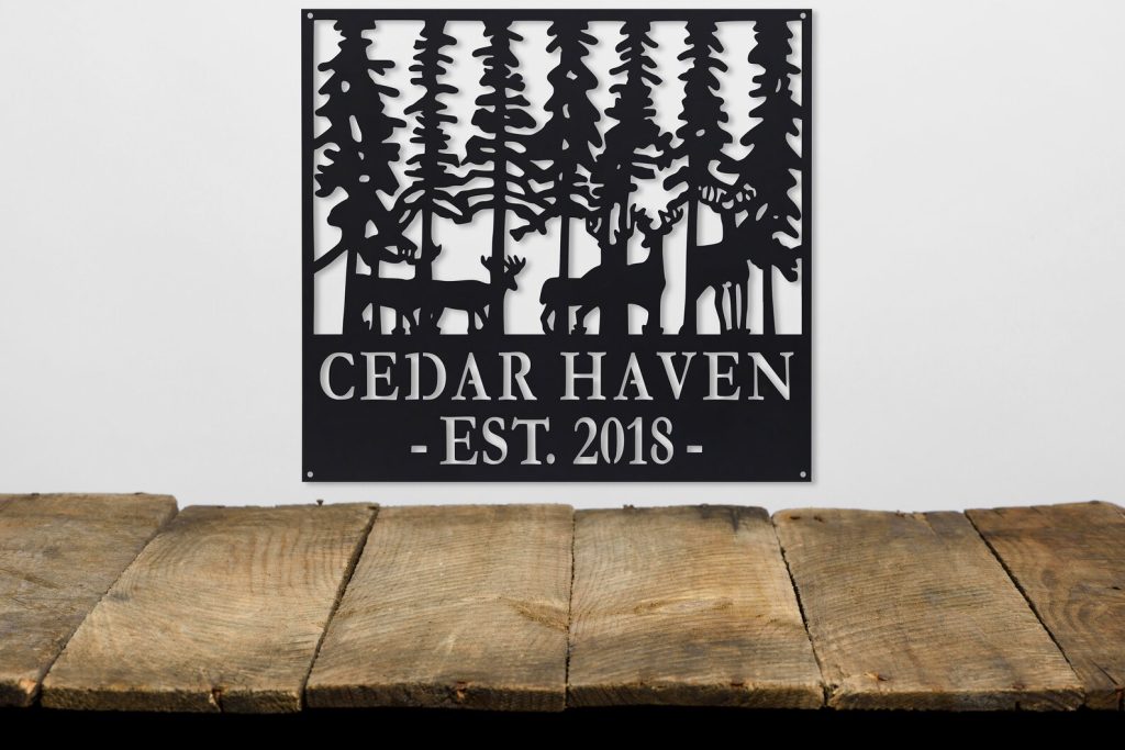 This personalized metal established sign will help remind you why you love the beauty of the wilderness and the mystery of the forest. The forest imagery with deer walking softly through the trees has a sophisticated look with a rustic feel that will add character and charm to any home.