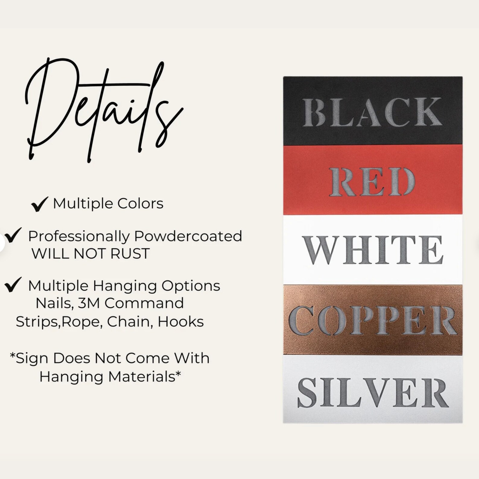 – 5 color option powder coated, Black, Red, White, Silver, and Copper
