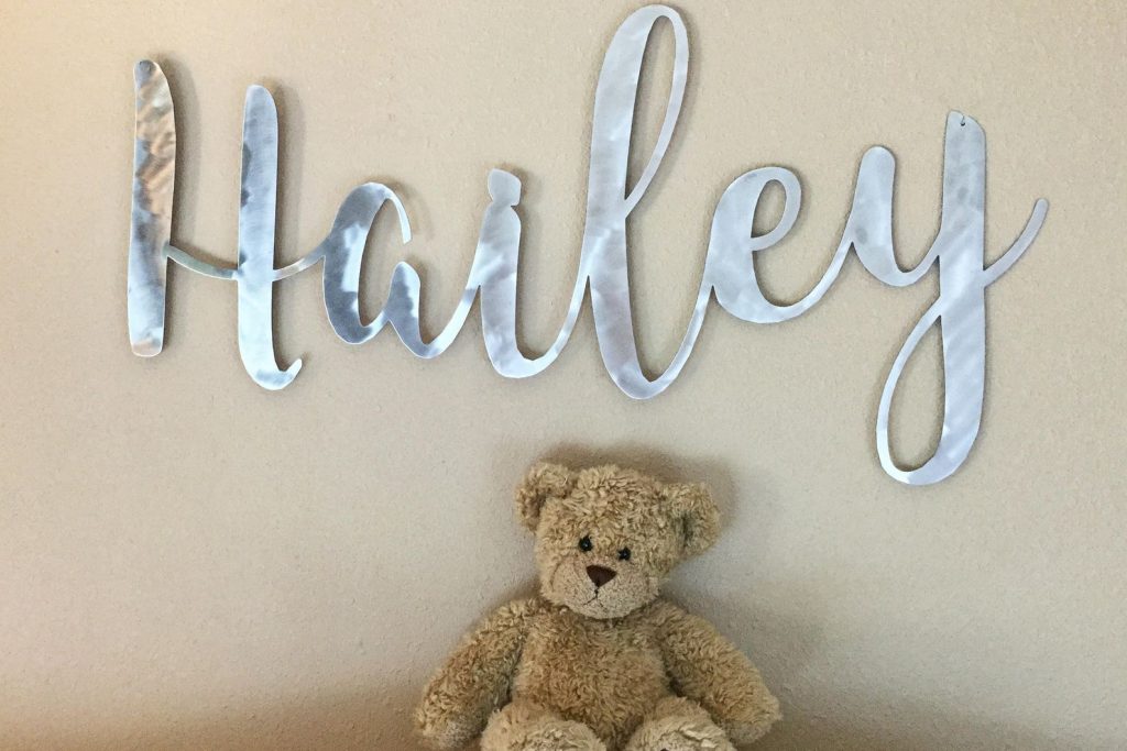 Thank you for shopping One Love Metals nursery name signs in metal! This listing is for a laser cut name sign. Name signs are the highlight of nursery decor and the best baby shower gift. Our custom name signs make beautiful wedding, business, and family home wall decor. Create any name, word, or phrase. You will LOVE it!