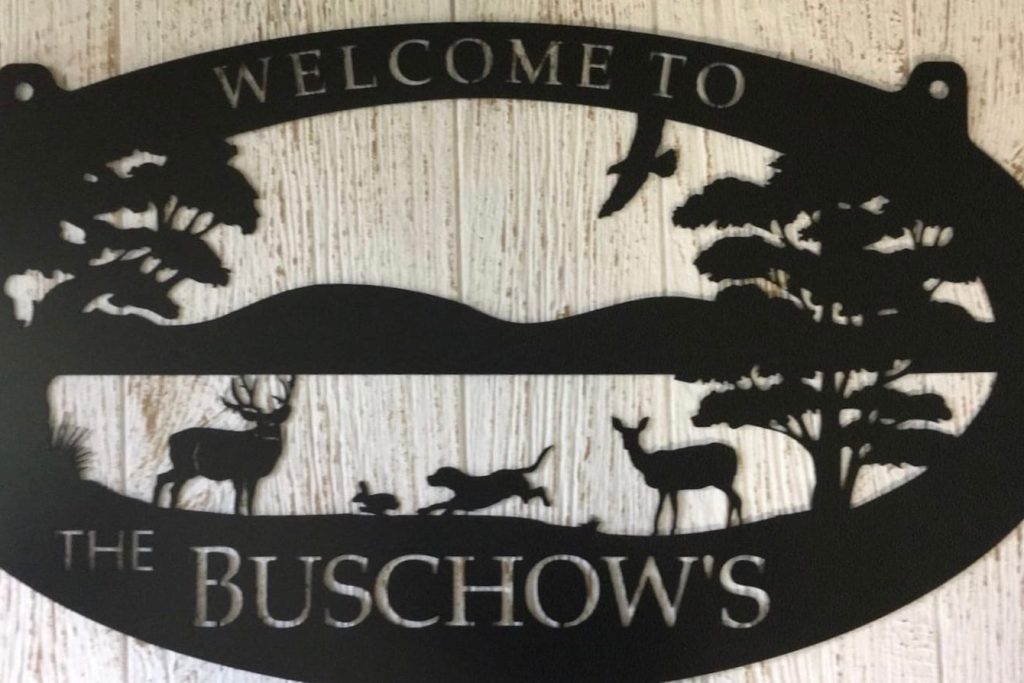 Be the first to review “3ft Metal Sign with Buck, Doe, Beagle, and Rabbit Scene – Customized with Your Name”