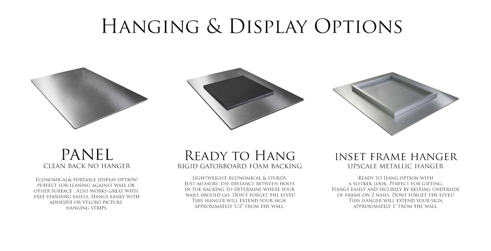 Two hanging options: Choose from Gatorboard Float backing for an economical hanger, or Metallic Inset-Frame backing for a more finished look and feel