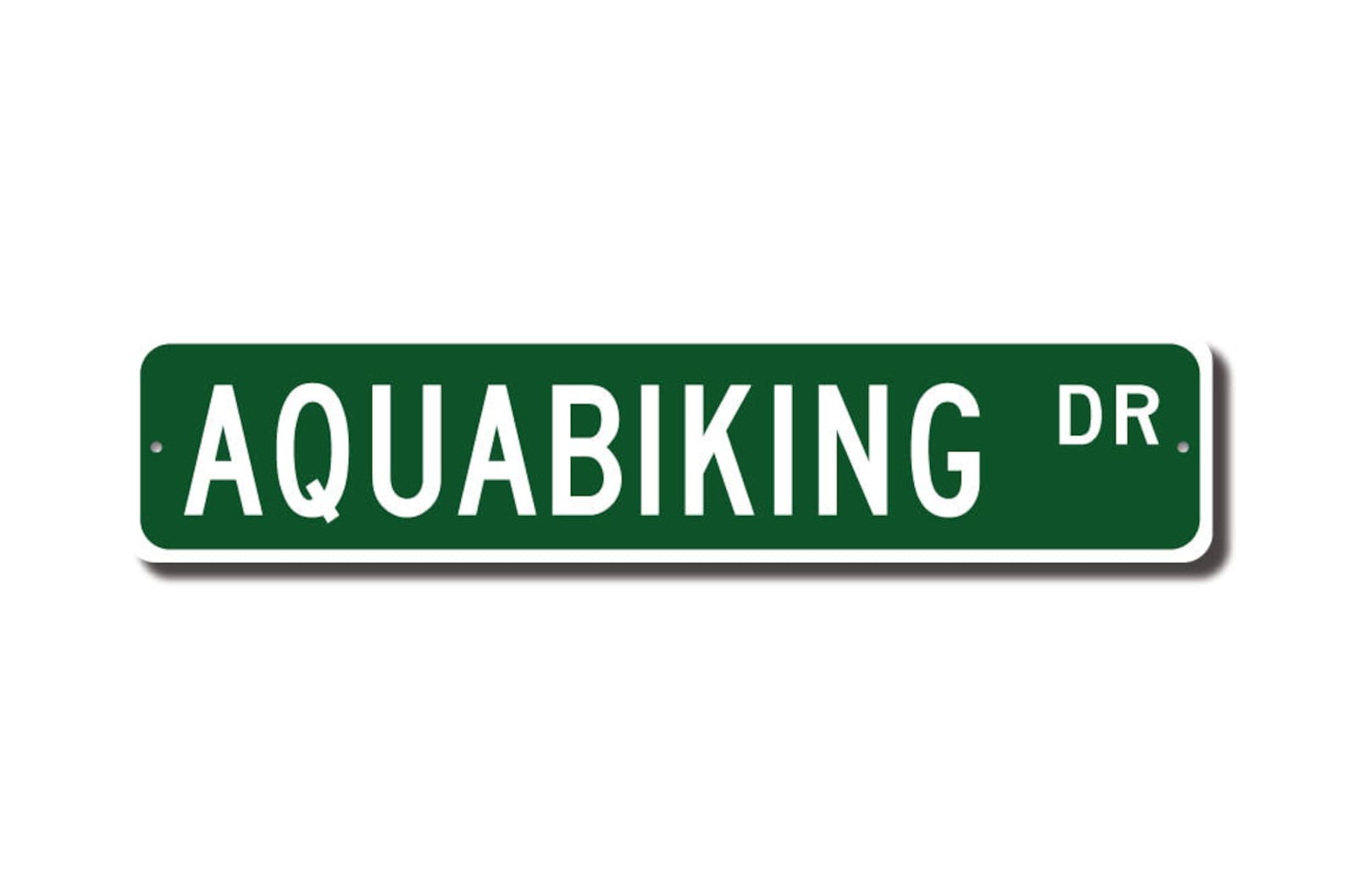 Aquabiking lovers check out this awesome street sign! This will make the perfect piece for any Aquabiking fan, or maybe you are an Aquabiking lover looking for a cool decor piece ! Made of premium aluminum it will stand the test of time. This sign will look great in any room, home den, cave, or office ! Get this sign for your favorite Aquabiking aficionado !