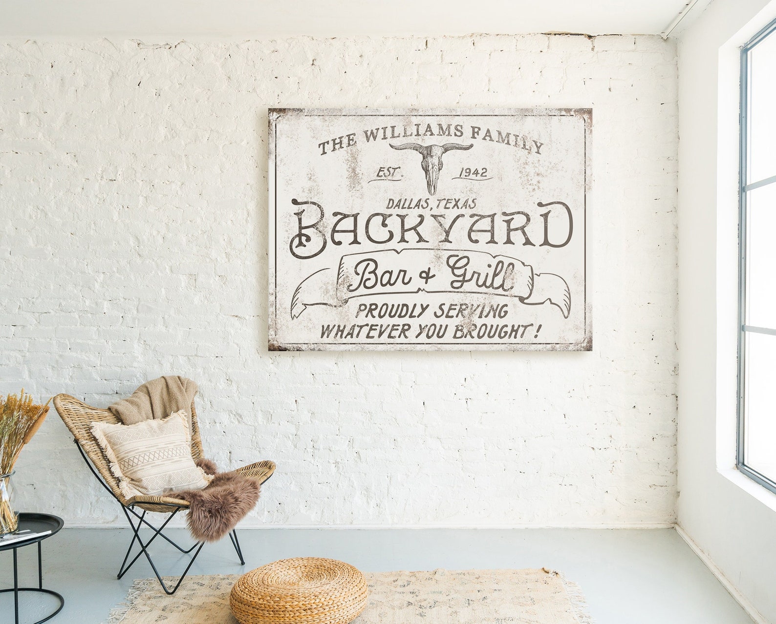 The rustic and weathered textures you see in the artwork will look the same no matter what item you order on. That means metal, wood, and canvas all have the vintage look to them!