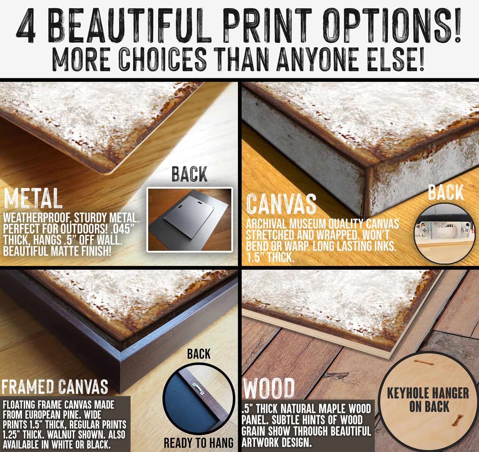 Choose from CANVAS, FLOATING FRAME CANVAS, METAL, or WOOD – The largest selection on !