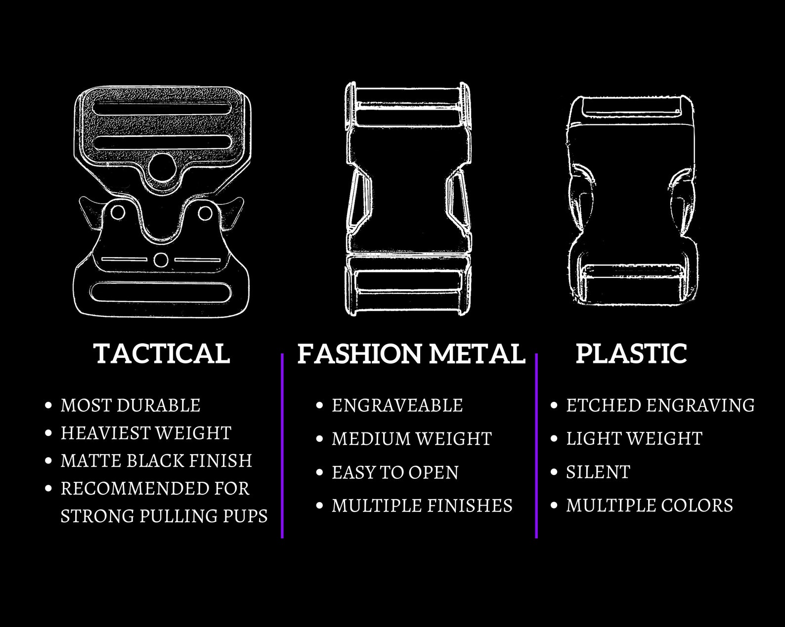 -We encourage all pet owners to use a harness for primary restraint while on walks or in social settings for the health and safety of their pup. We recommend our Tactical Buckle or, Martingale and Limited Slip collar styles for leash reactive or strong pulling pups if a collar is preferred. These styles can be found listed in our shop separately.