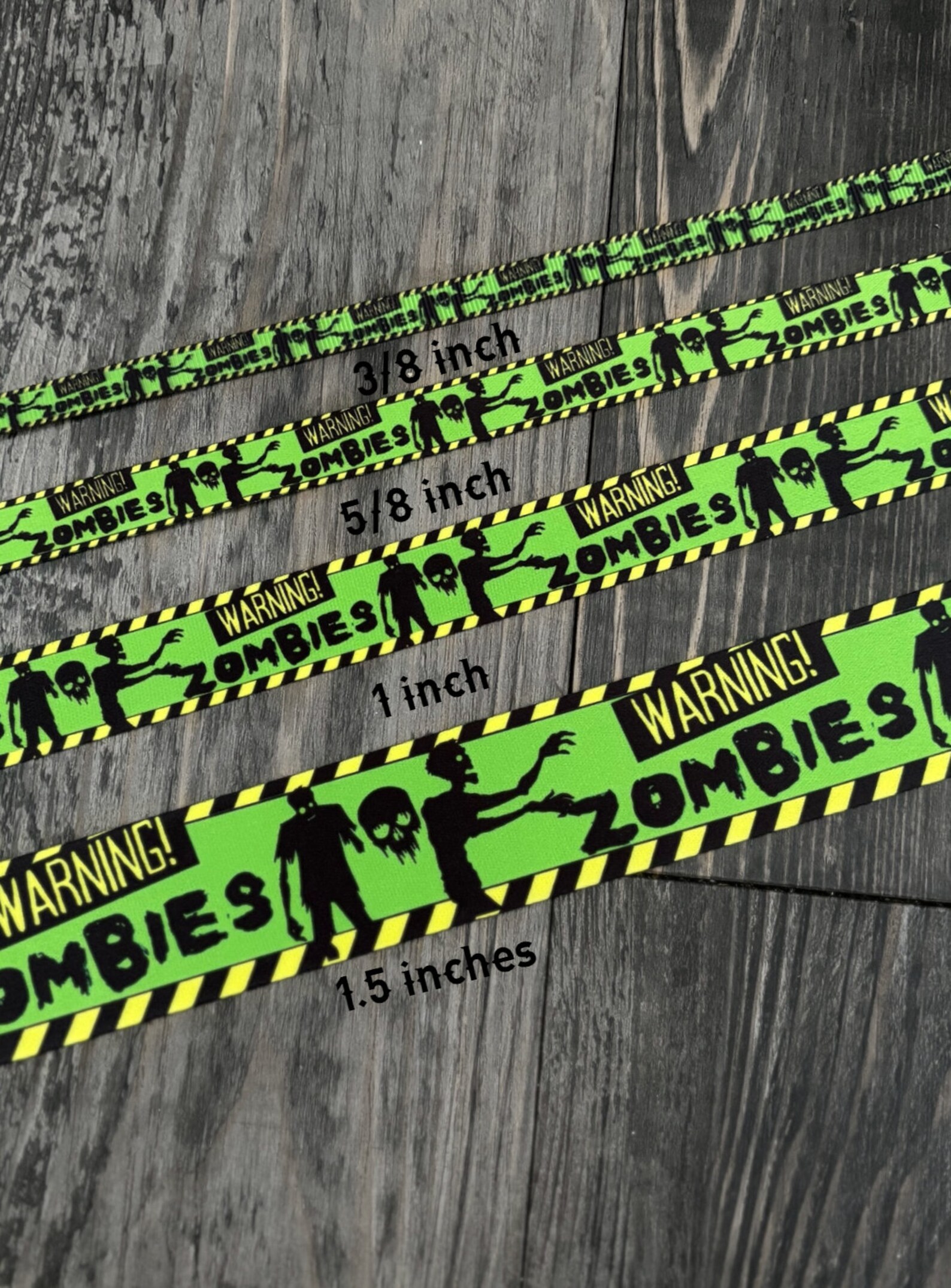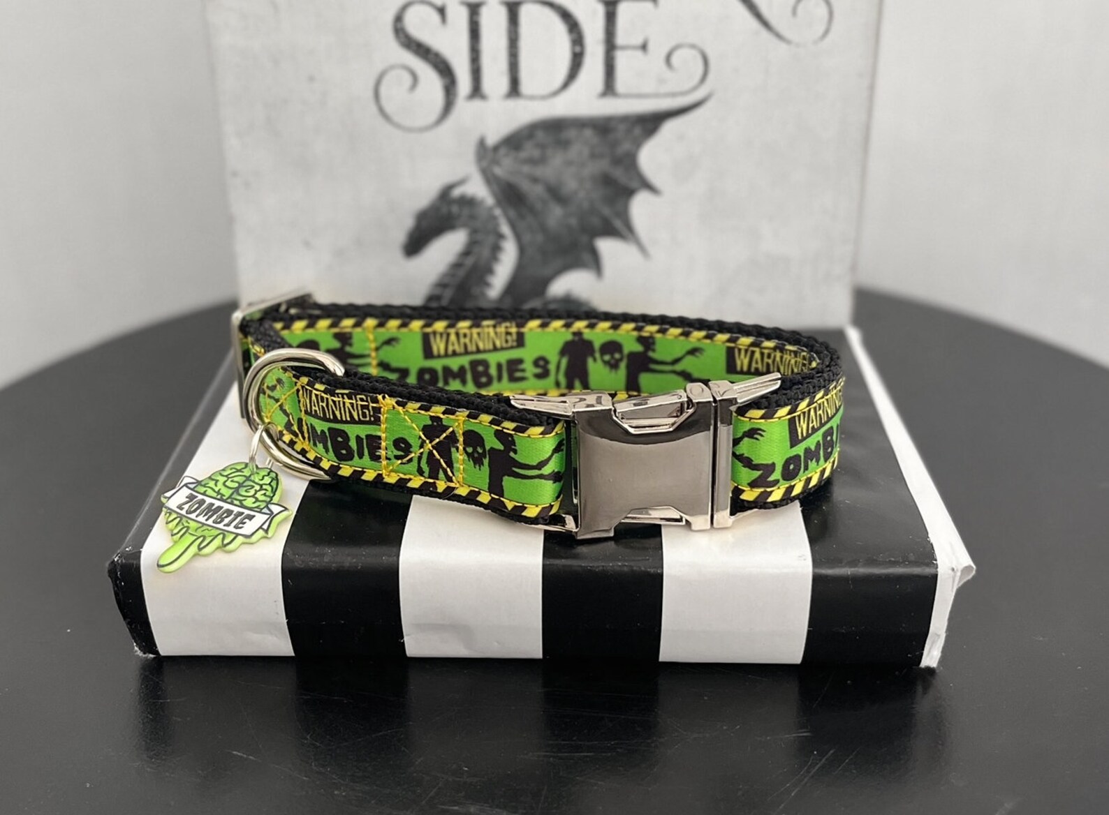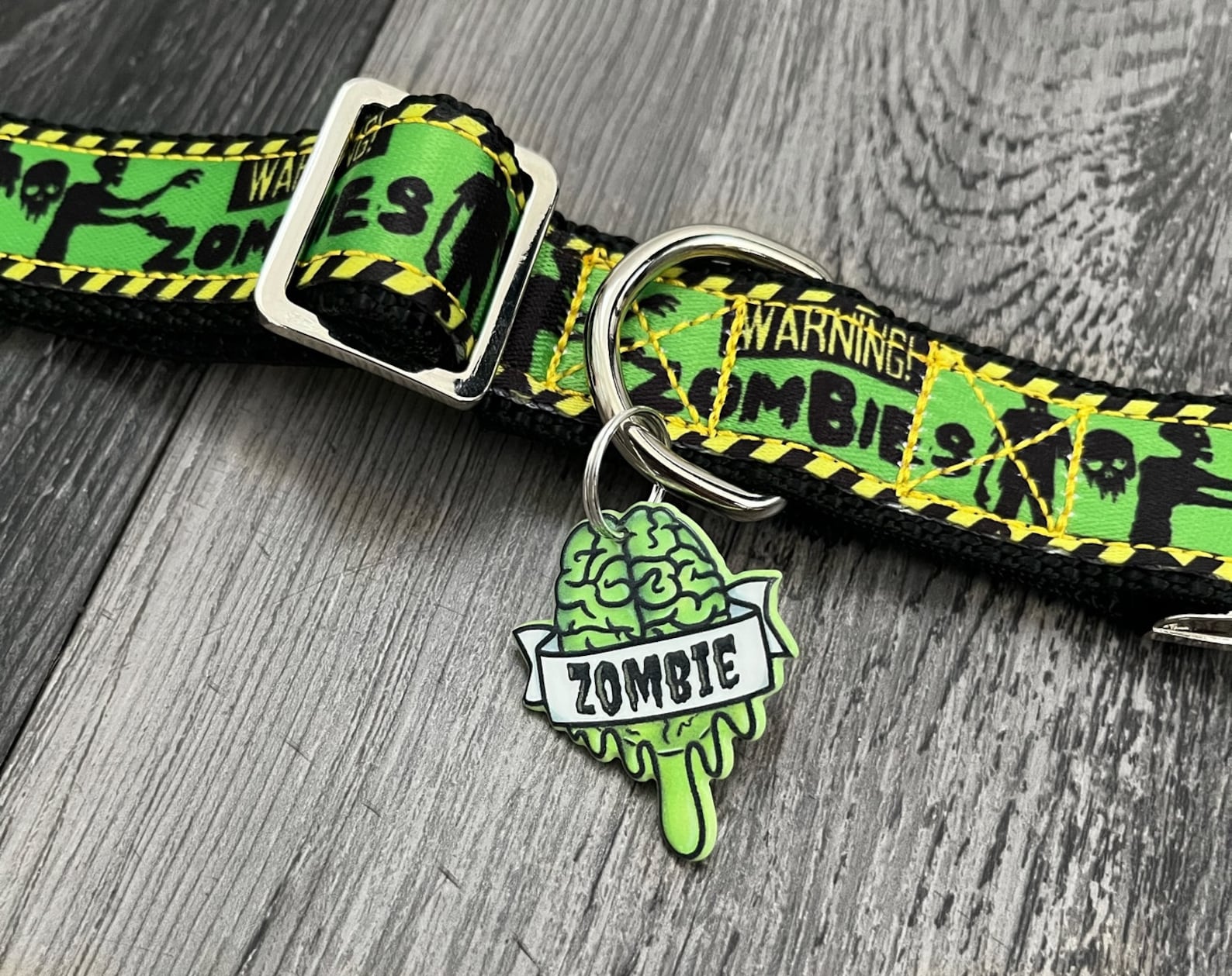 Zombie invasion caution pattern canvas on black heavy duty nylon with a silver metal, green plastic, or black tactical buckle, and silver metal hardware. Each collar is paired with a resin zombie brain charm (38mm.) All collars are adjustable. Buckle personalization is available for 5/8", 1", or 1.5" width collars. Engraved plastic buckles are black.