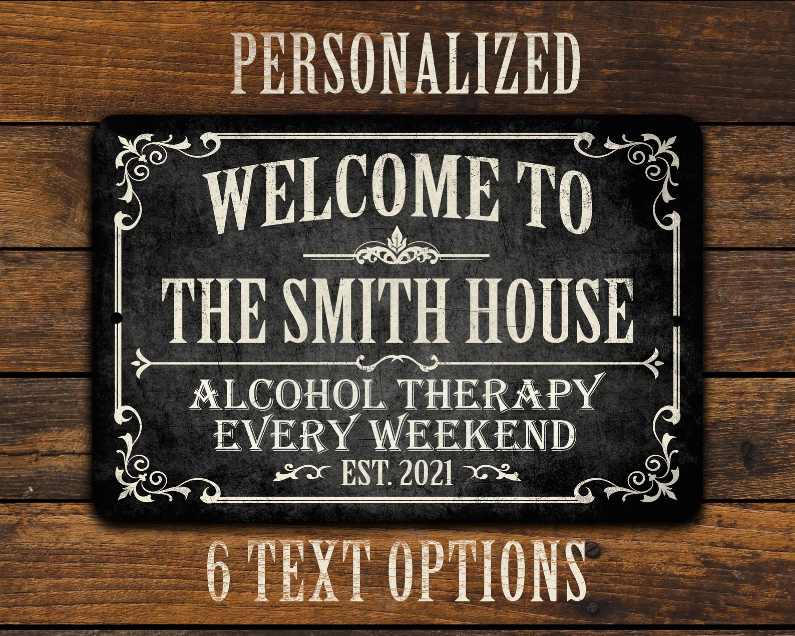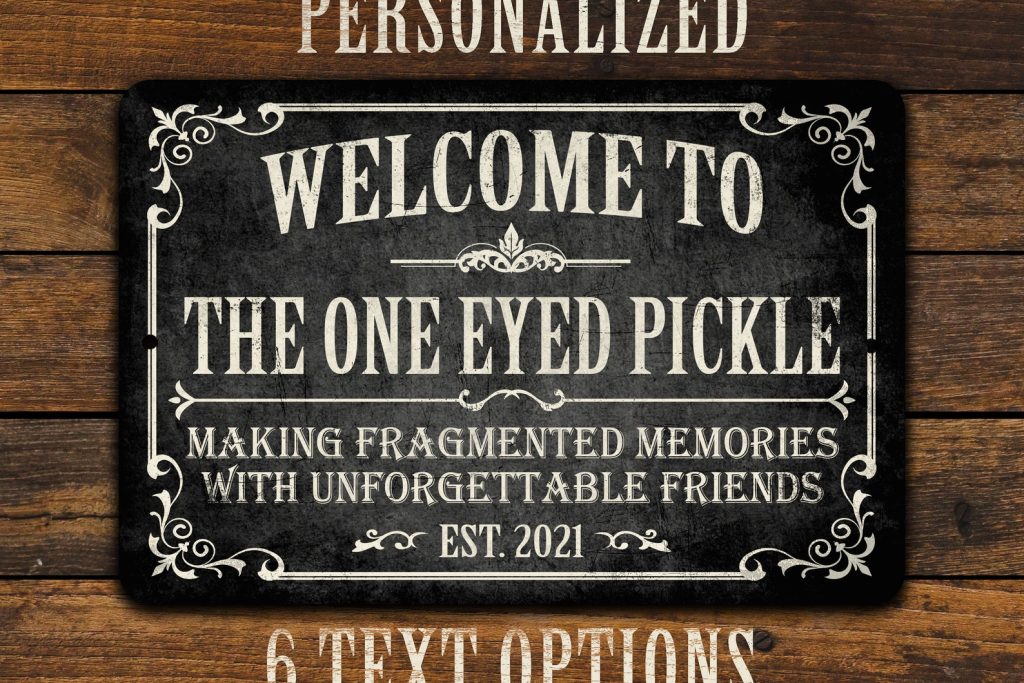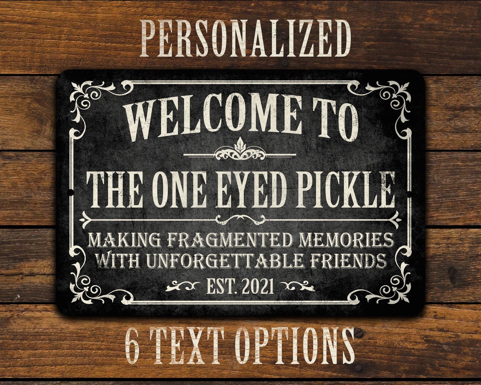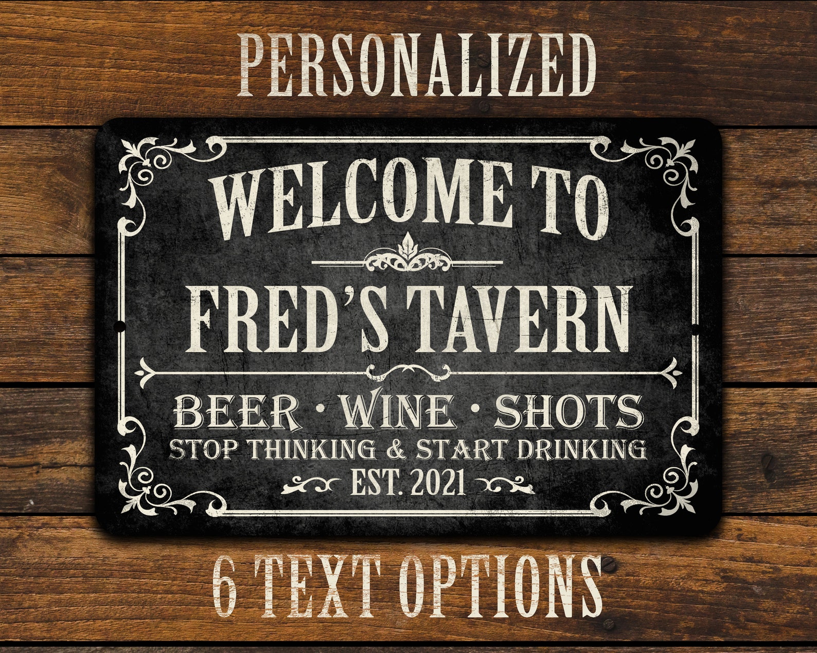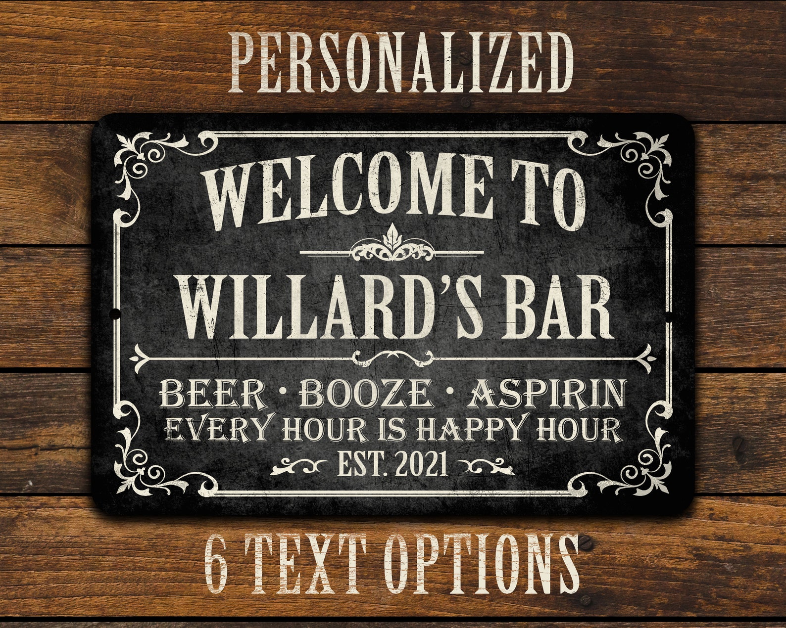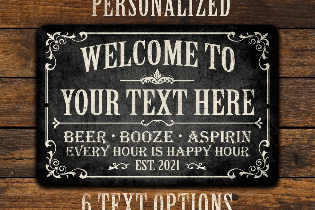 3) Enter your personalization information. Type the et text or phrase you9;d like printed on the sign for the bar name, followed by an established year. Your text will be printed in ALL CAPS only. For best results, please limit to no more than 20 characters. The more characters you use, the smaller the text will have to be to fit. If no established date is provided, the current year (2024) will be used.
