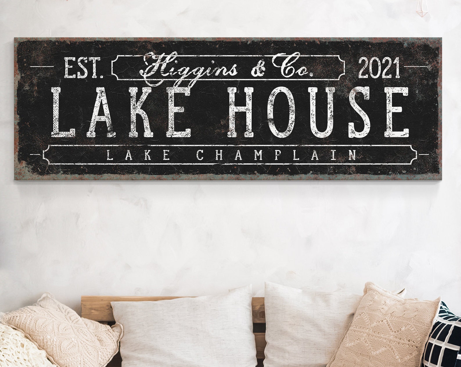 This custom vintage sign is a unique addition to your modern farmhouse decor! The graceful fonts and distressed texture add effortless, rela style to your home, or vacation getaway.