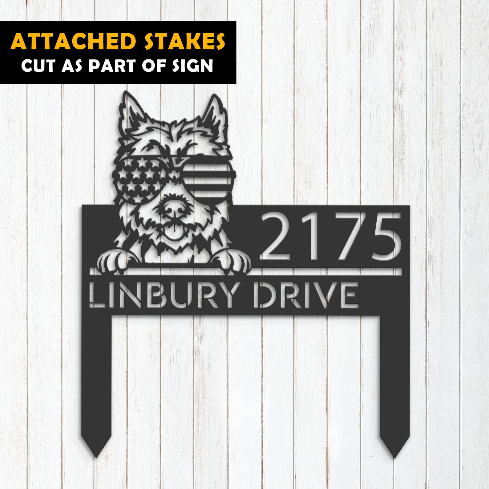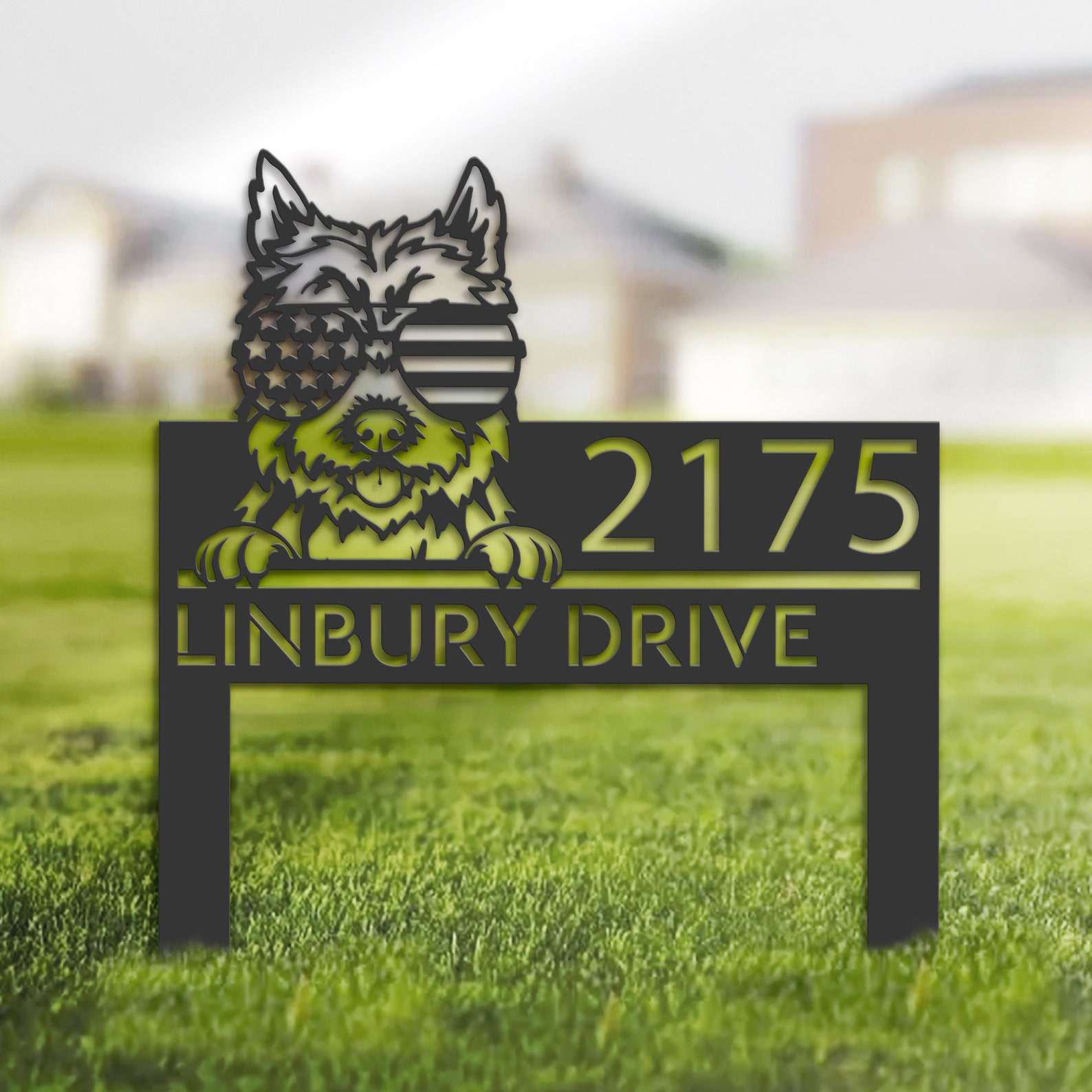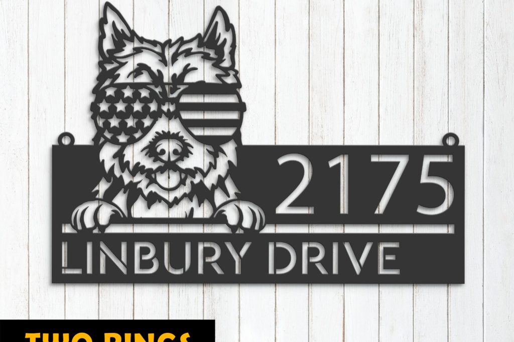 Be the first to review “Cairn Terrier with US Flag Glasses Metal Address Sign”