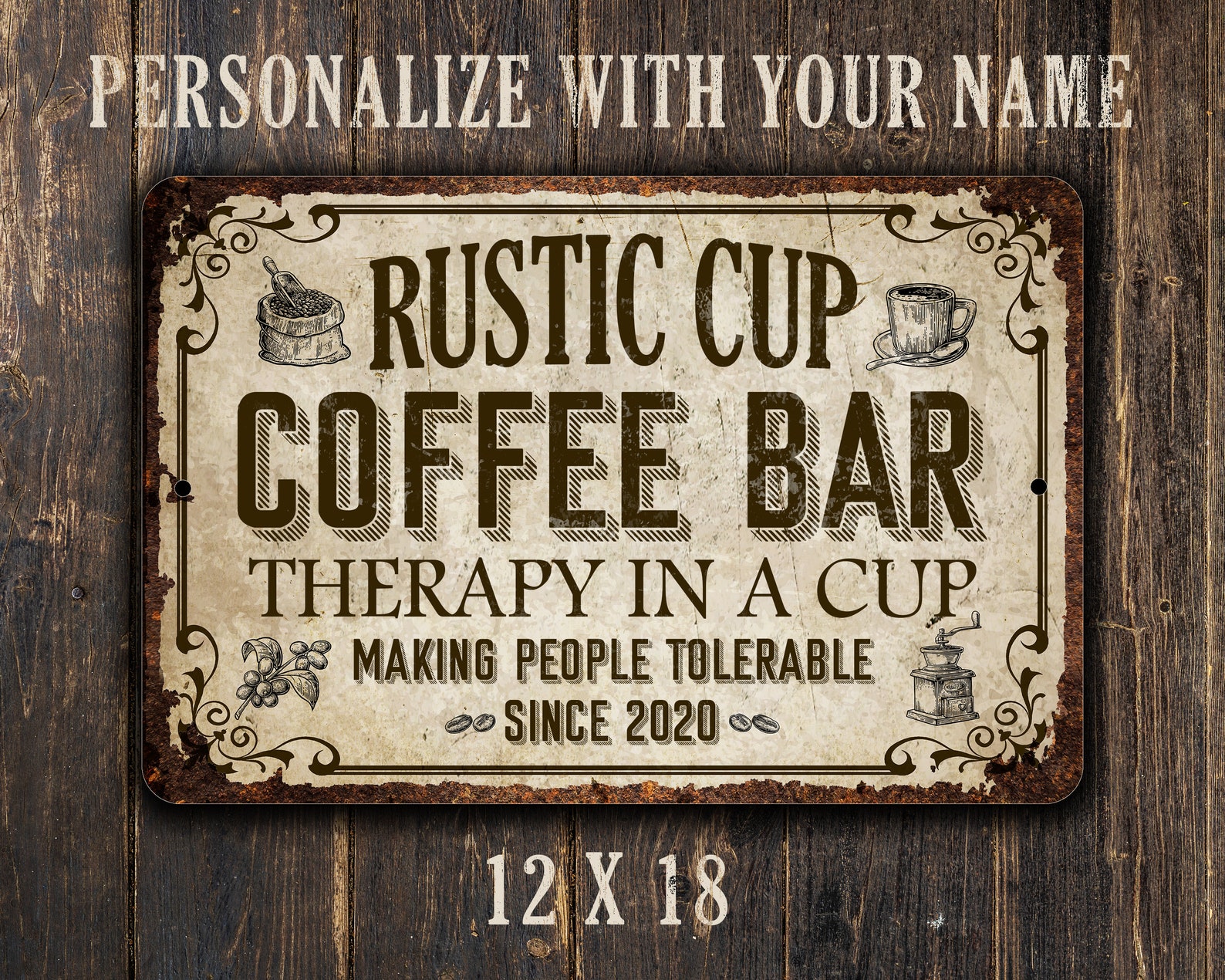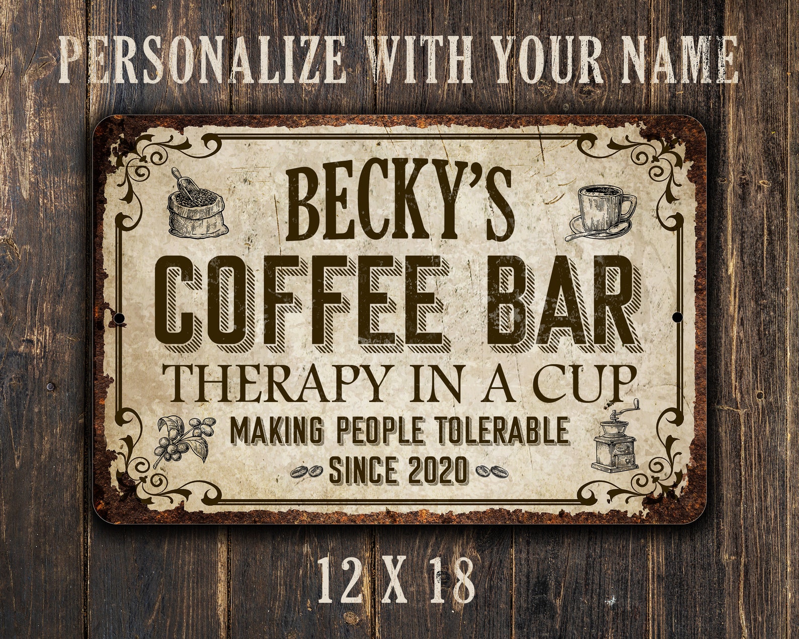 Personalized Metal Coffee Bar Sign | Customize this sign with your first name, last name, or whatever you choose! | Great Gift | Designed with a weathered, antiqued look that will go well with any decor! | Great for business office coffee stations too!