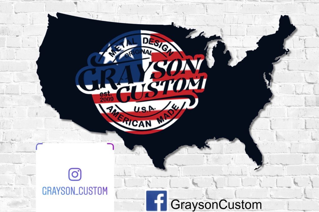 Our metal works are 100% made here in the USA with high quality Domestic materials. Every piece arrives ready to hang in your favorite indoor or outdoor space. You may choose from our most popular 14 Gauge metals including: Polished Raw Steel, Steel with a colored finish, a Rusted Patina, Brushed Aluminum, or Stainless Steel.