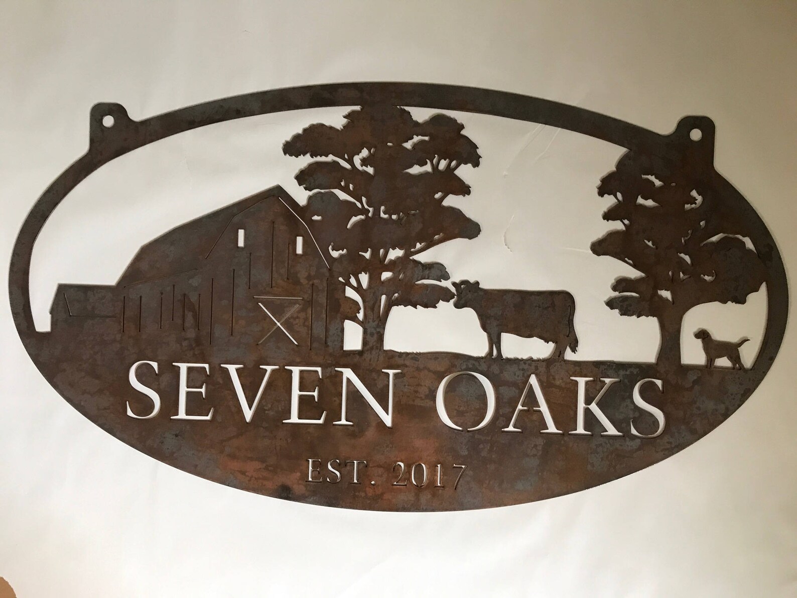 Rustic, personalized metal sign with barn and cow and oak tree scene . Measures 36" x 20" or 48