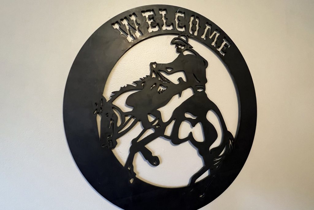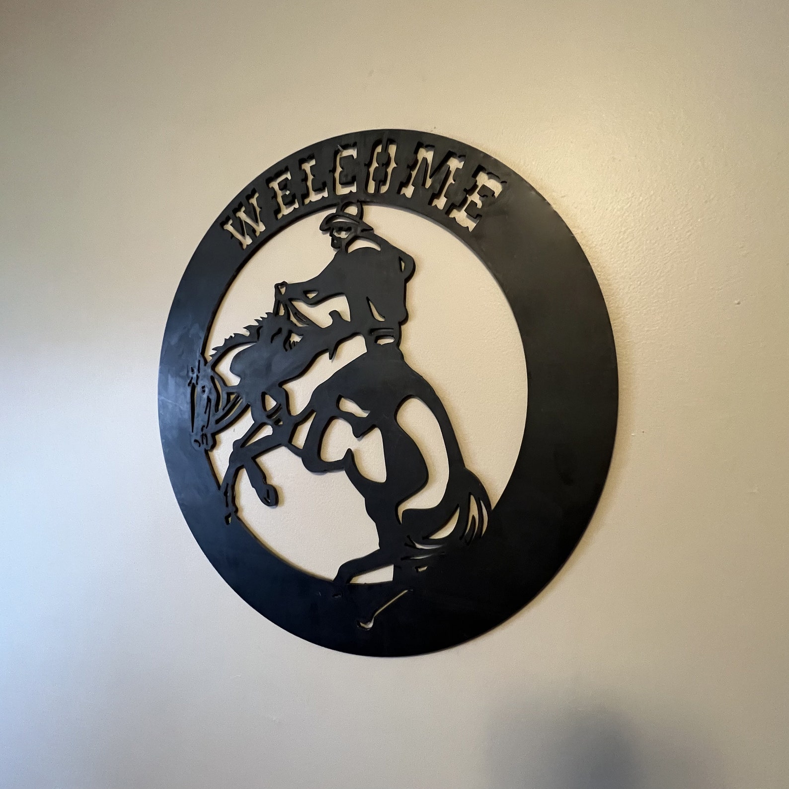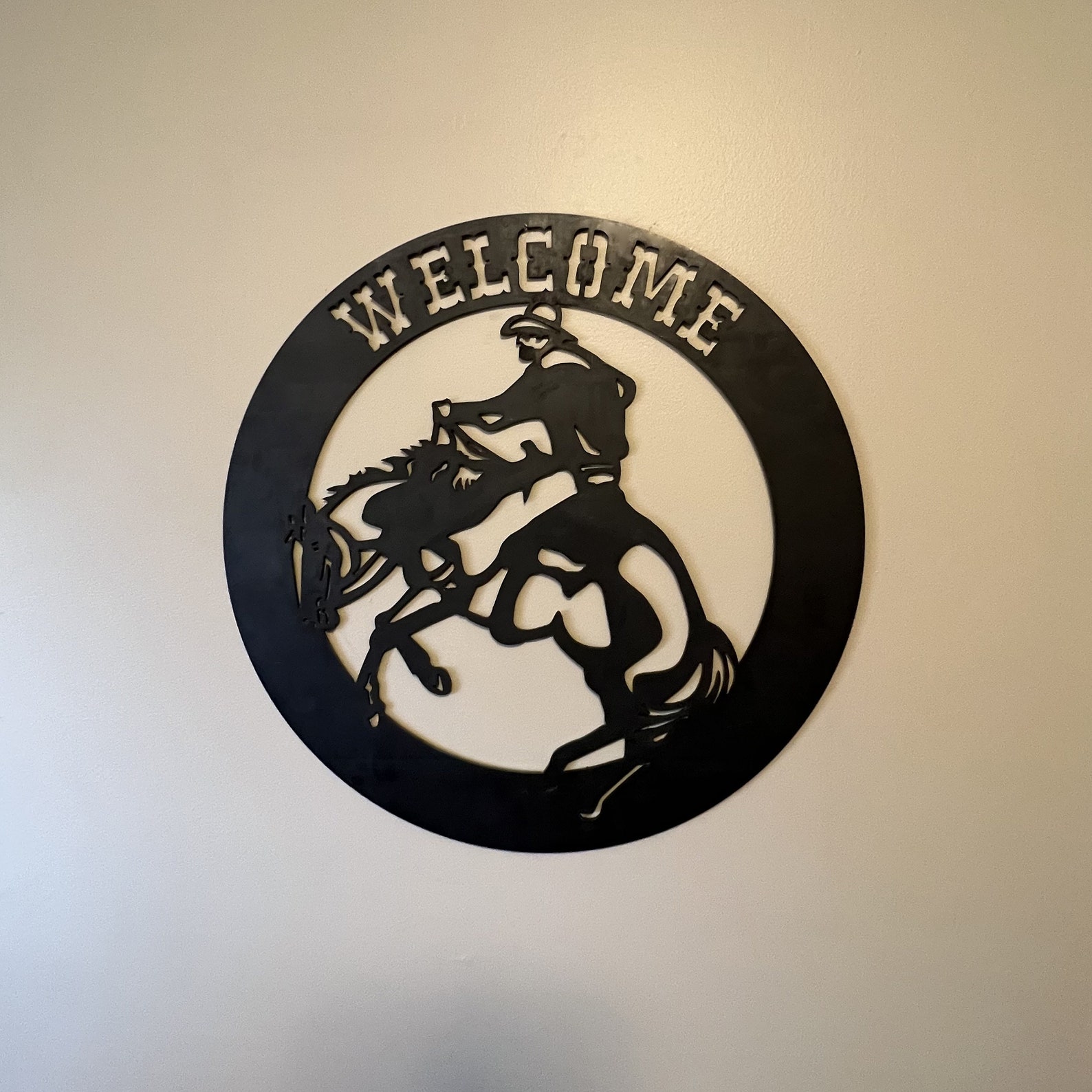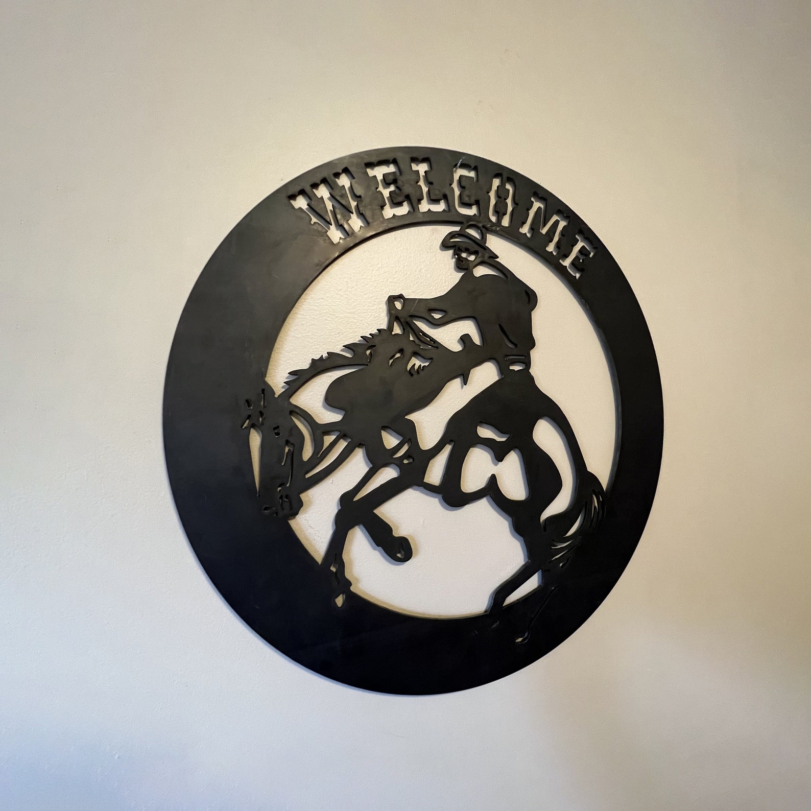 Welcome guests in true cowboy style with our Cowboy Circle Metal Sign. Crafted by Metalcore Welding & Repair from durable black metal, this sign showcases a cowboy riding a bucking bronco within a welcoming circle.