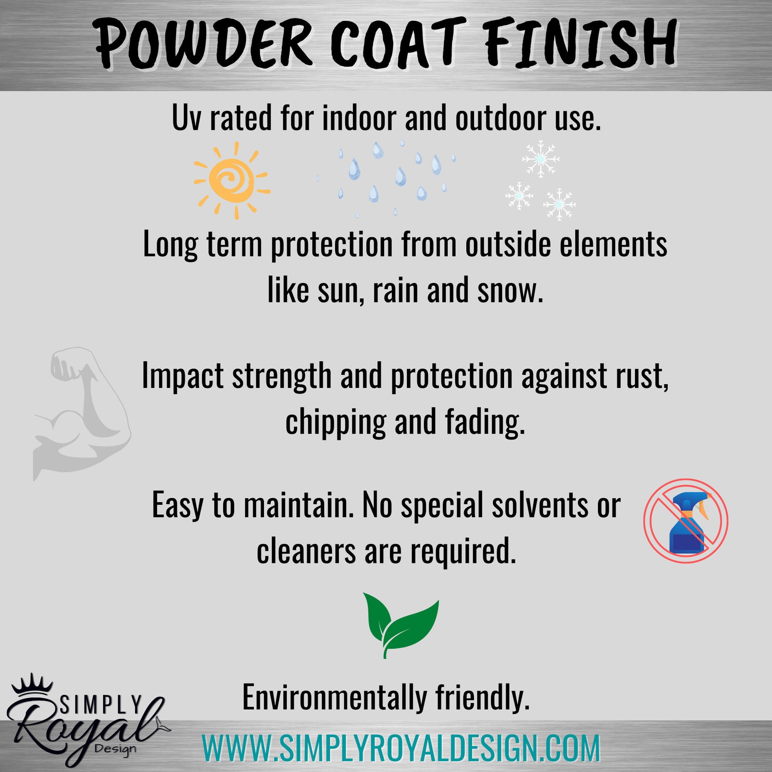 We use top quality materials and our powder coat is rated for both indoor and outdoor use. No maintenance required!