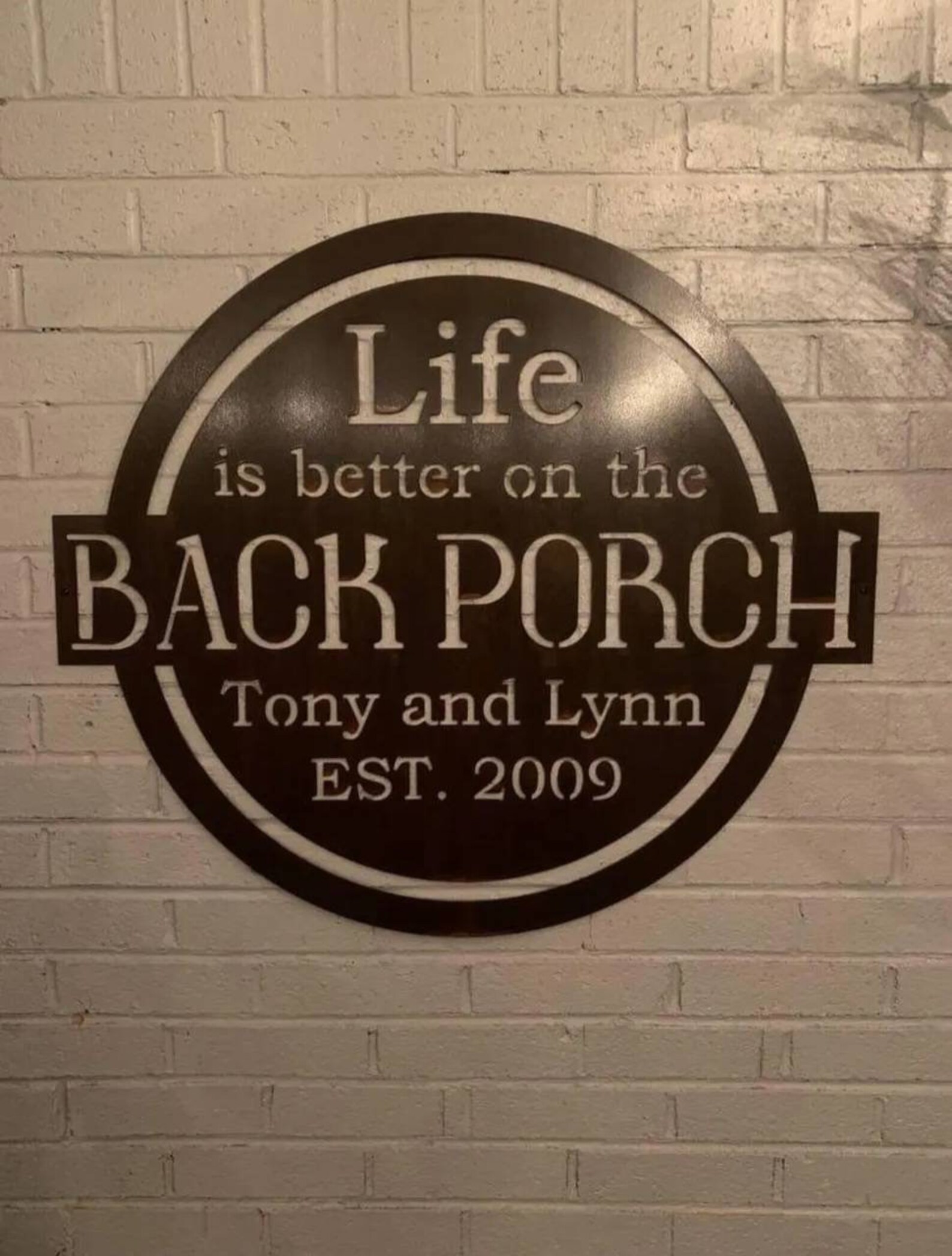 Personalize Life is better on the Back Porch Metal Sign to your home! It is made out of 16-gauge metal and is powder coated for durability. It is weather resistant, so it is perfect for your back porch! This would make a great wedding gift, birthday gift, gift for couples, housewarming gift, gifts for her, and anniversary gifts.