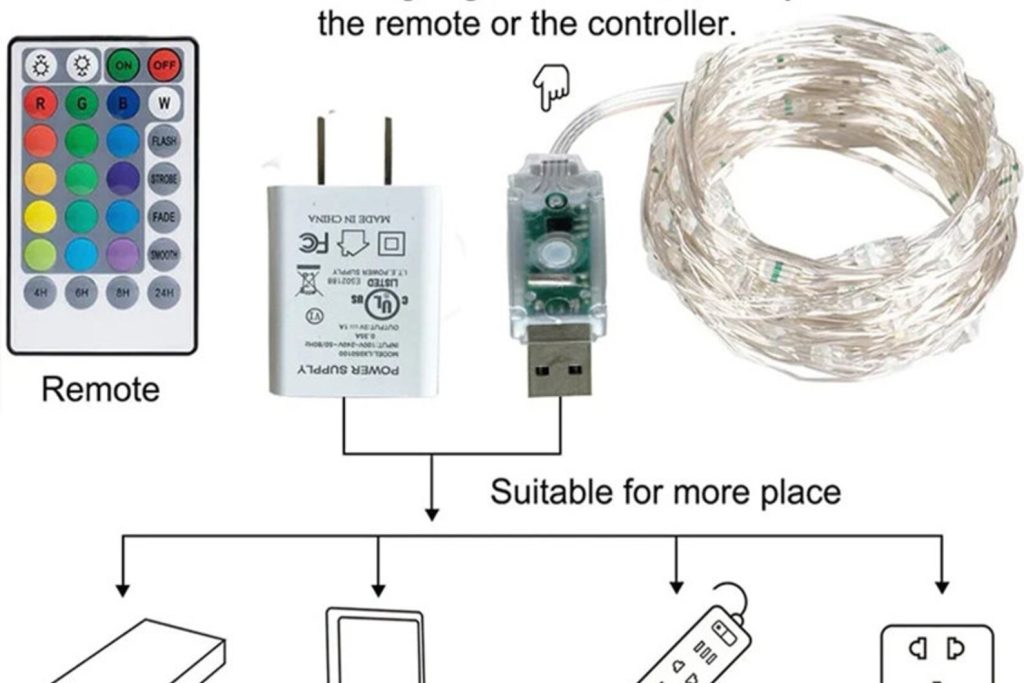 The USB plug enables you to plug this string of LED lights into the USB hub and power adapter. You can go to the store to buy a CR2025 button battery.