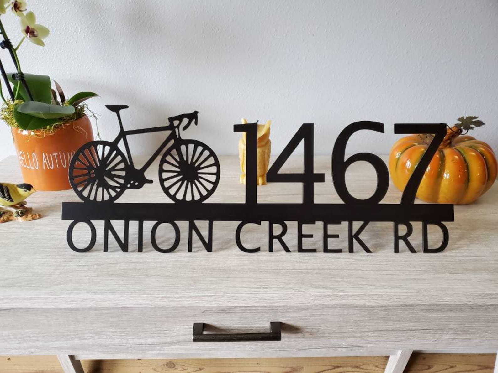Custom metal personalized address sign/house numbers with bicycle bike for your rock or wall. Finished with highly durable exterior matte black powder coating. This address sign is made out of highly quality durable/sturdy 1/8 inch thick steel(12gauge). This gives the item a very sturdy feel. Item comes as shown in listing photos numbers are offset to the right. We will send you a mock-up of the design. Size is 8 but the height does vary slightly depending on text length.