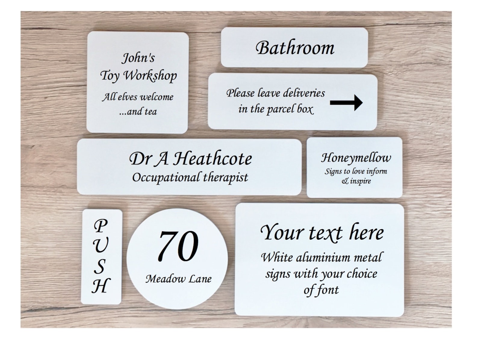 Customization is made using professional grade outdoor vinyl adhesive applied to the metal sign.