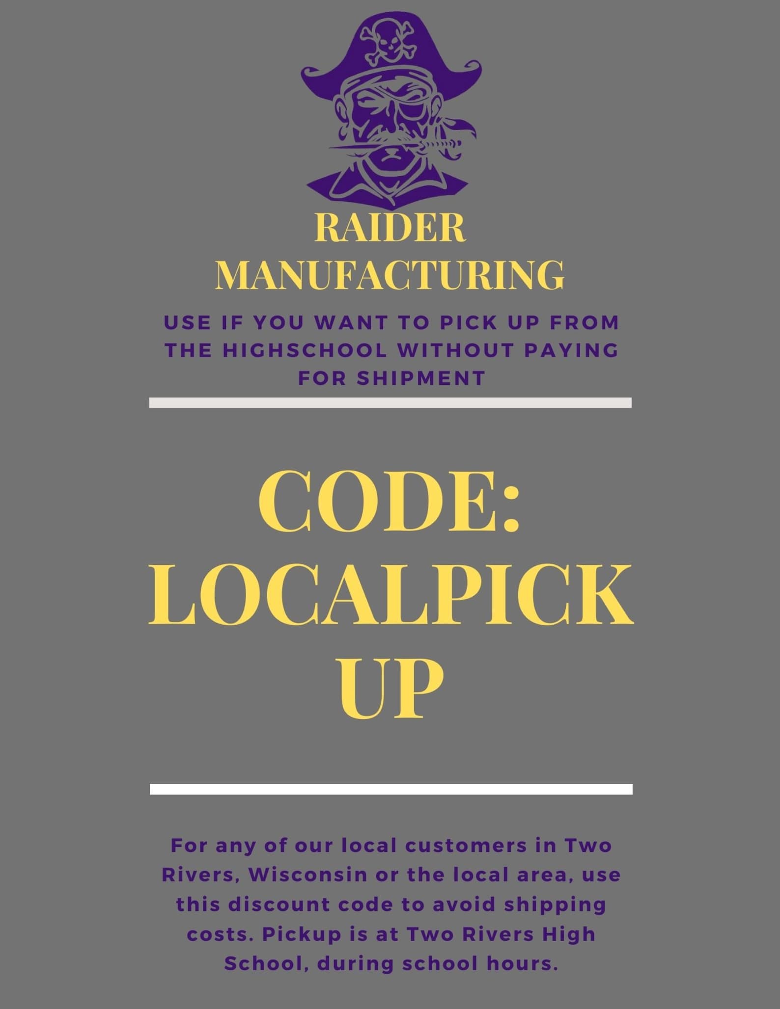 Enter the coupon code LOCALPICKUP during checkout if you wish to pickup from the high school.