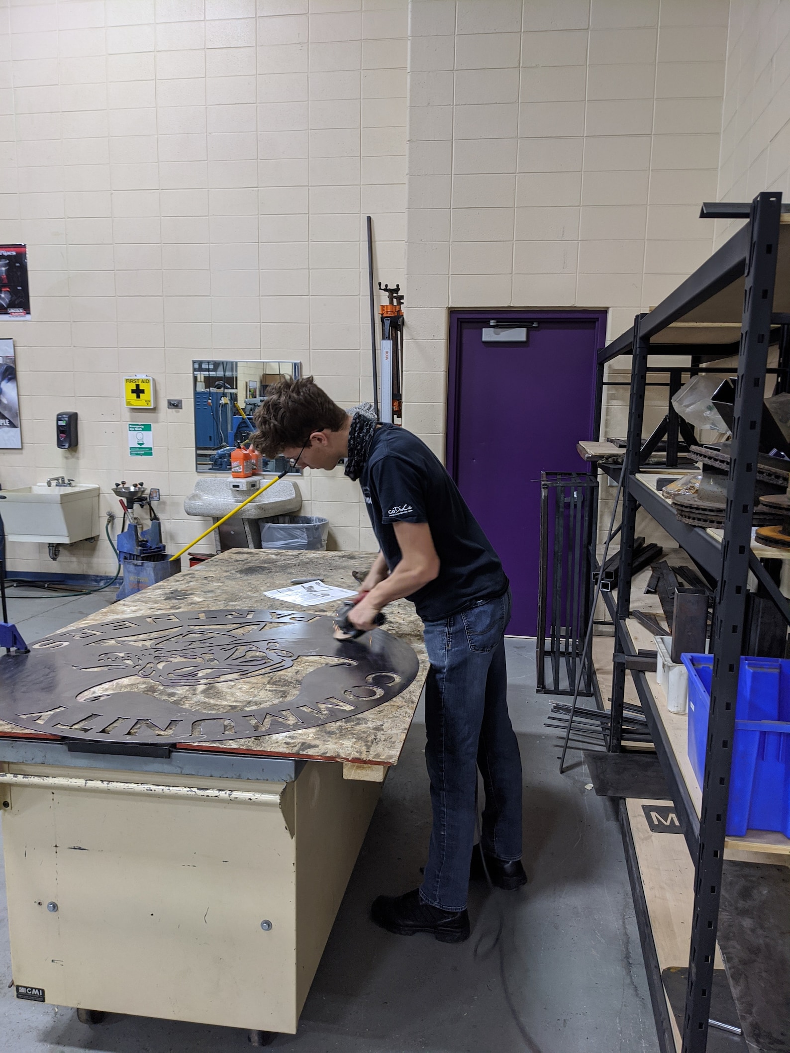 Plasma cut out of 16 gauge steel sheet metal by high school manufacturing class.