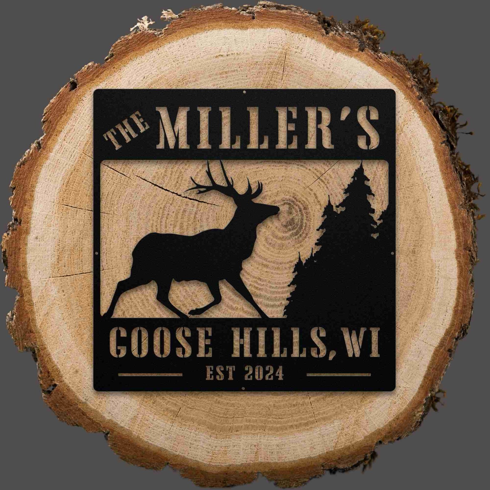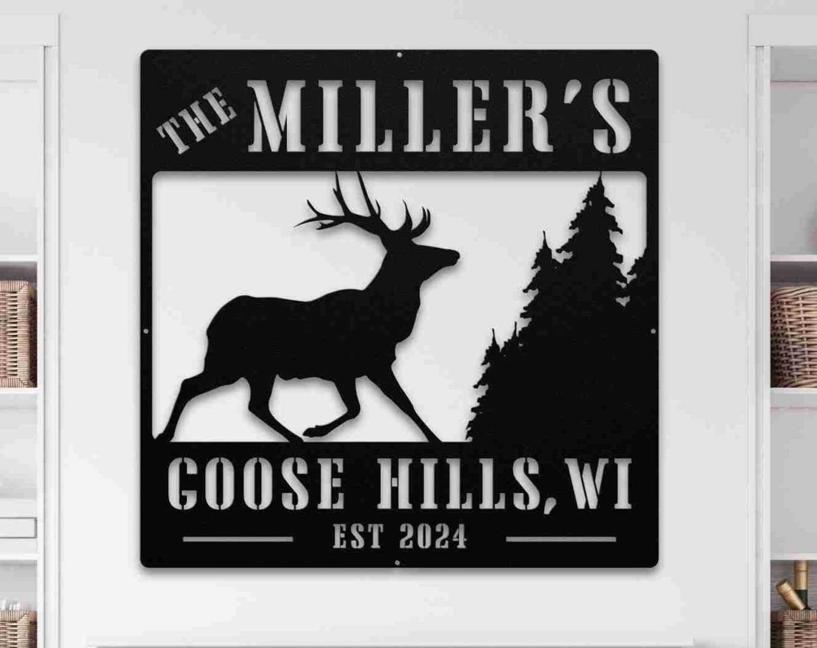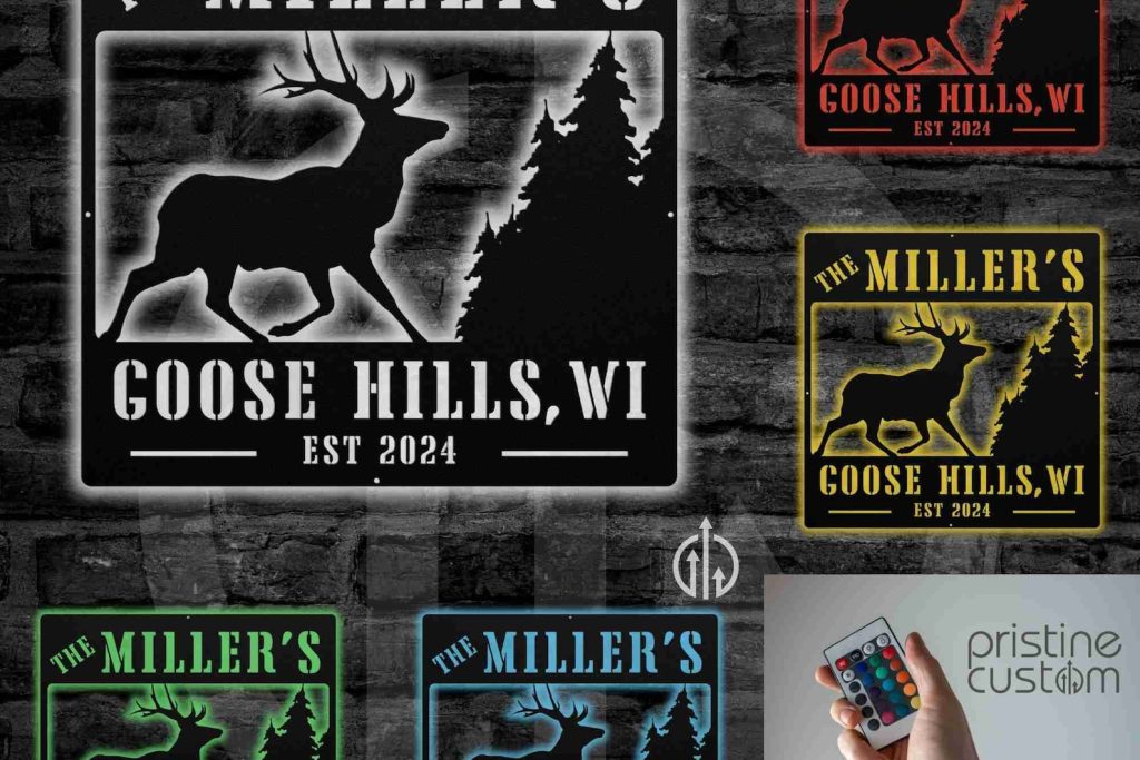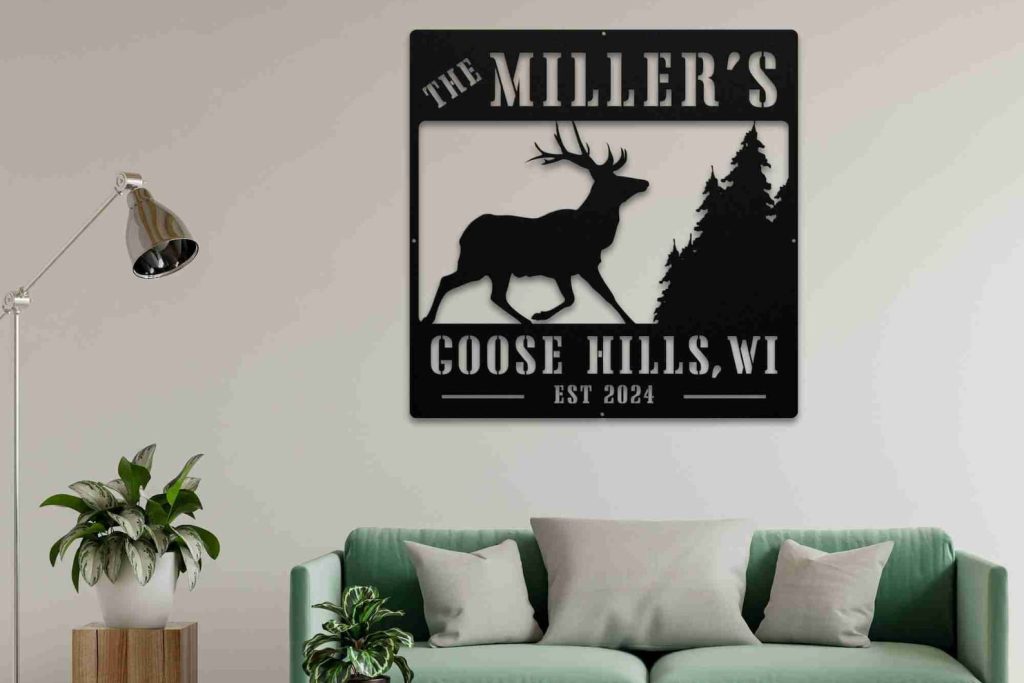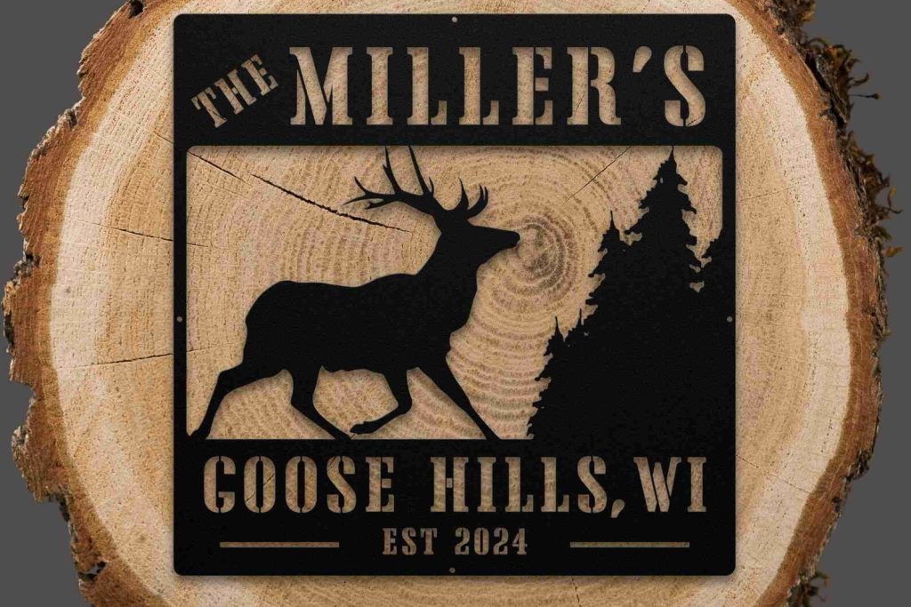 Celebrate the beauty and warmth of your cabin or cottage with our Deer Elk Buck and Trees Custom Family Name Sign. Handcrafted with skilled craftsmanship, this sign features a stunning design of deer, elk, bucks, and trees, making it a perfect addition to your rustic home. Personalize it with your family name for a unique touch.