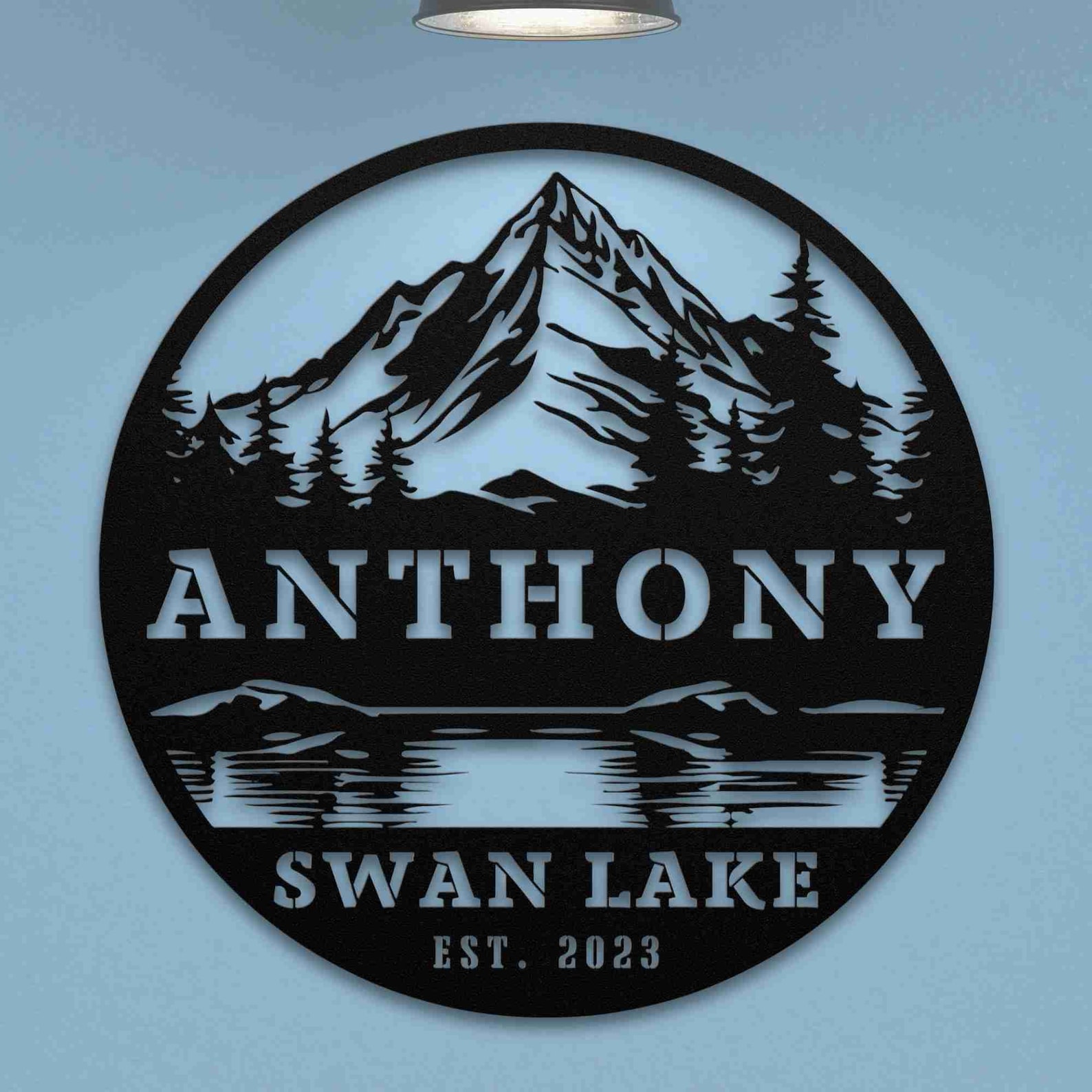 Handcrafted with expert craftsmanship, our Lake with Trees and Mountains Round Custom Family Name Sign features a serene lake nestled among towering trees and majestic mountains. Showcase your family name and add a personal touch to your home decor with this unique, beautifully designed round sign. Bring nature9;s beauty into your home with this charming piece.