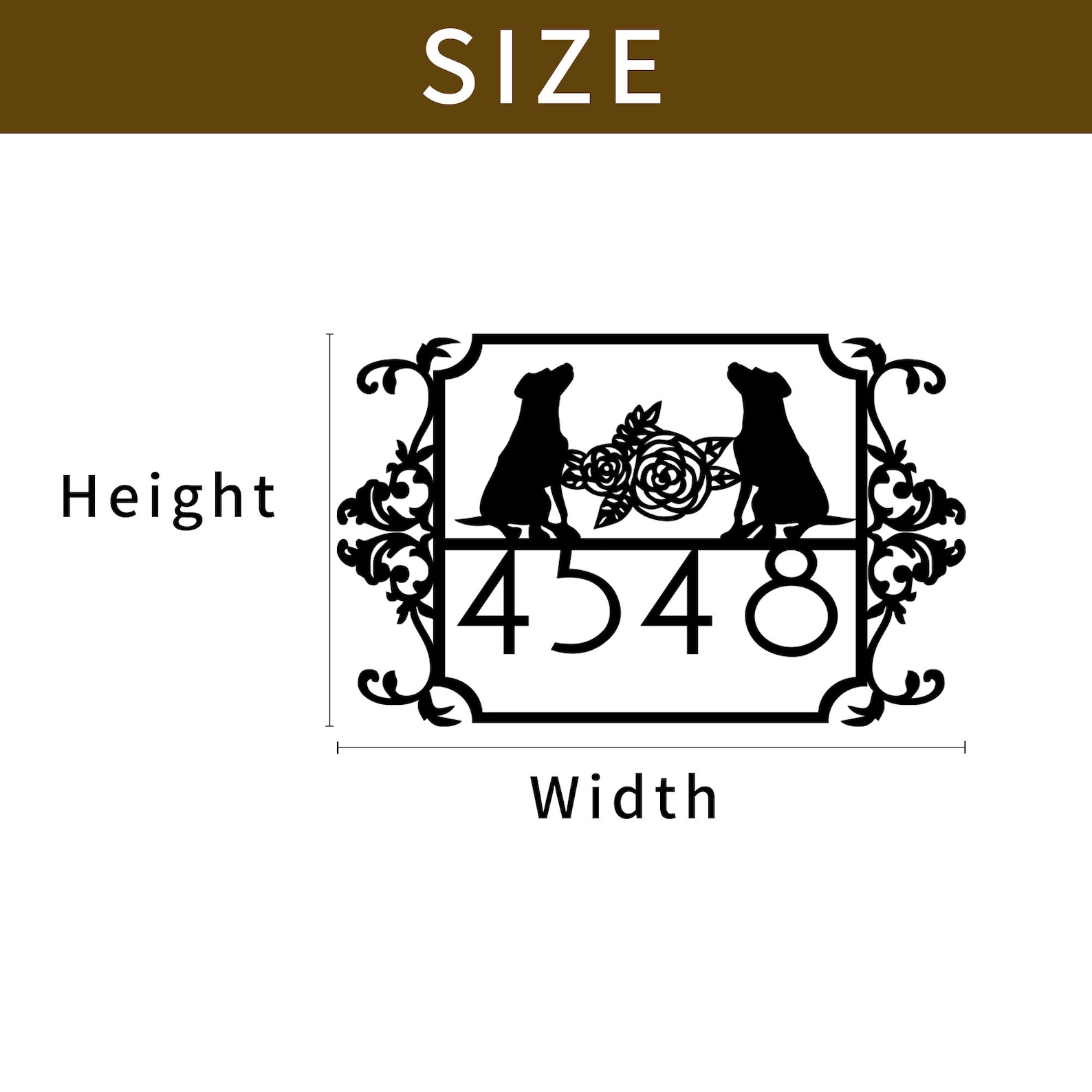 Horizontal Dog Silhouette Address Sign. Made with 14 gauge American made steel and powder coat to help prevent rust and discoloration. Made from high-quality metal, our custom address sign is durable and weather-resistant, ensuring that it will last for years to come. The sign can be customized with your address or any other text that you choose, making it a truly unique and personalized addition to your property. It can be used as a family property to last for generations.