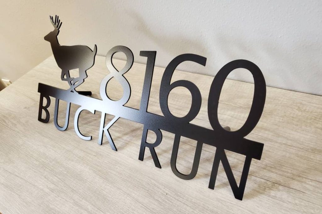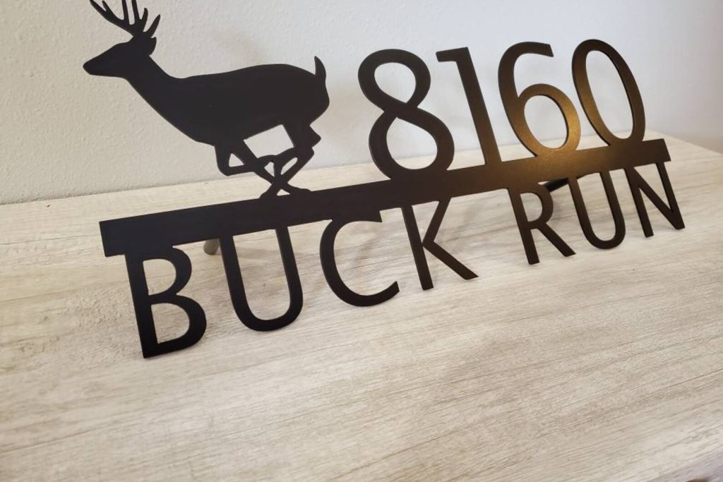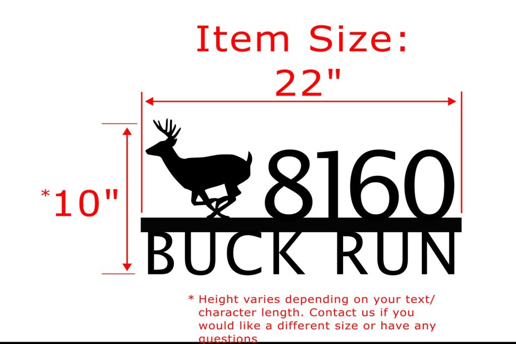 Custom metal personalized address sign/house numbers with running buck deer for your rock or wall. Finished with highly durable exterior matte black powder coating. This address sign is made out of highly quality durable/sturdy 1/8 inch thick steel(12gauge). This gives the item a very sturdy feel. We will send you a mock-up of the design. Size is 1 but the height does vary slightly depending on text length.