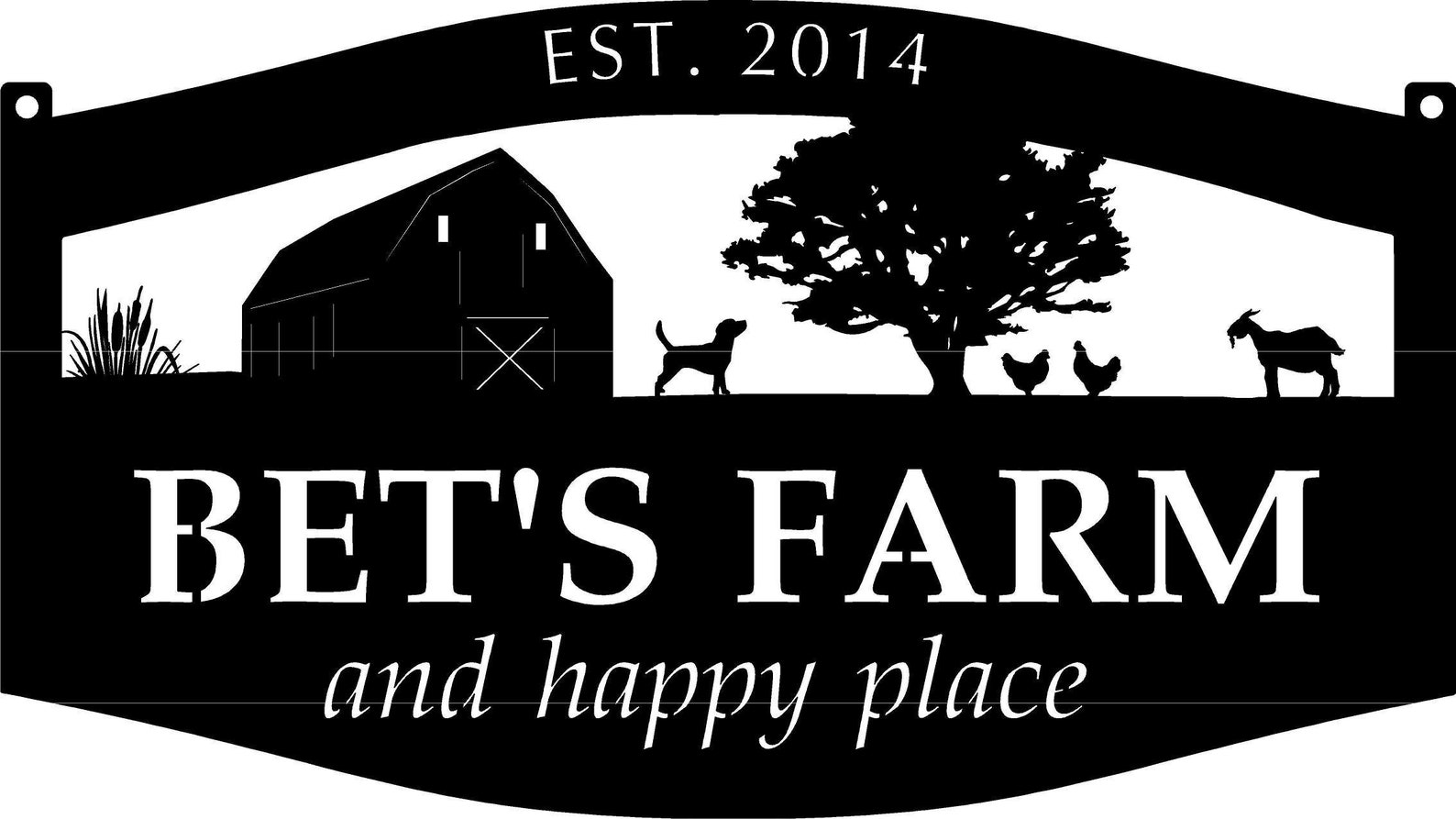 Rustic, personalized metal sign with barn and goat scene. Measures 36x 20 or 48"". Powder coated black or beautiful rustic acid finish and clear coated . Makes a very attractive entrance sign.Incl with the price is customizing with your name.Our finish is a baked on powder coat for a very long lasting durable finish.