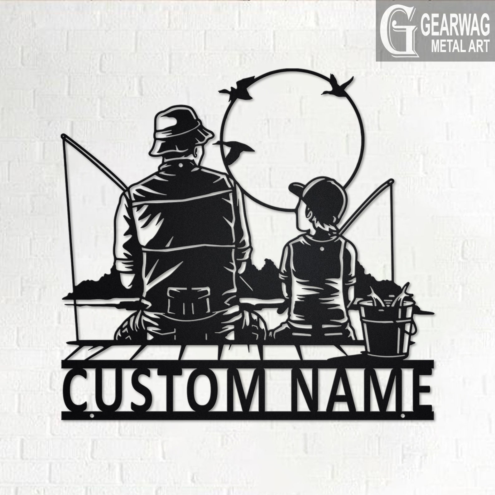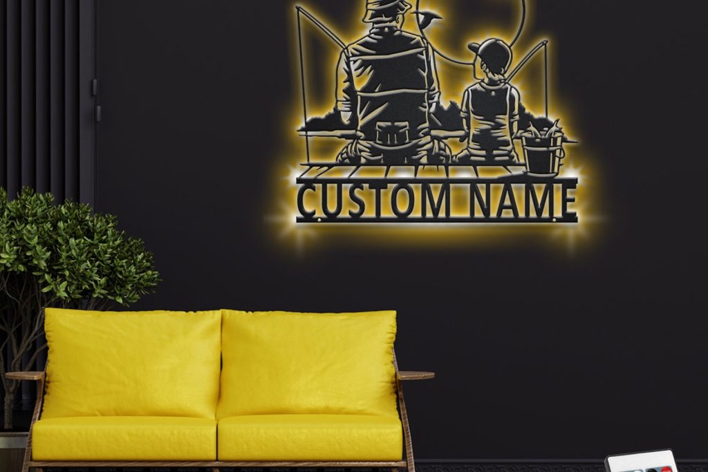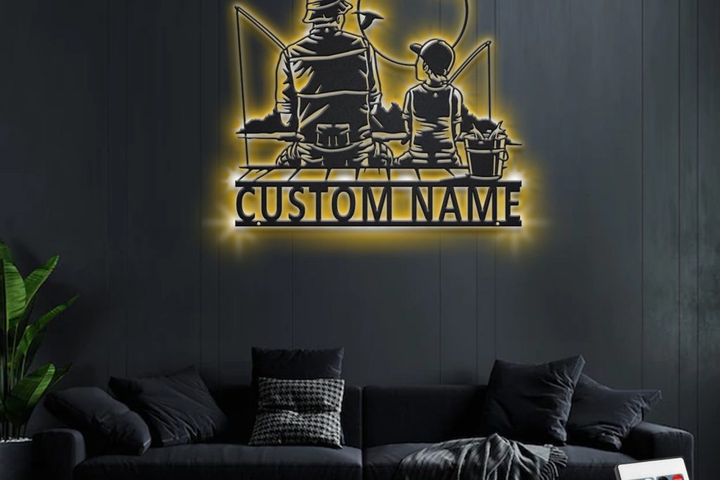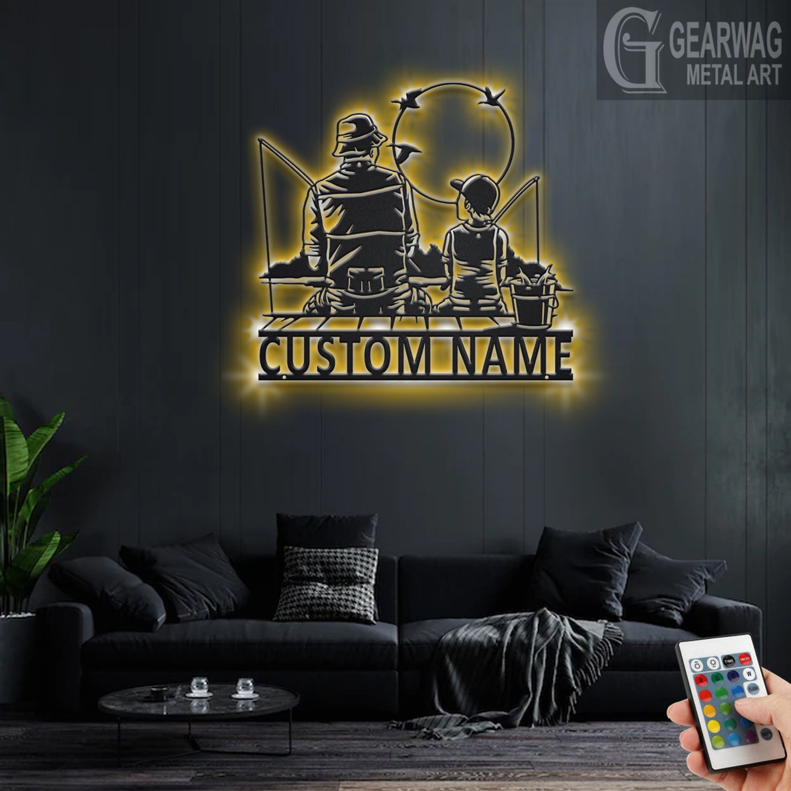 Custom Father and Son Fishing Metal Wall Art with LED Light