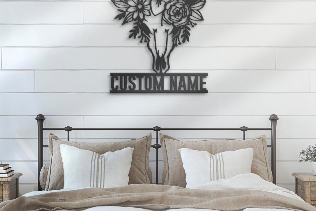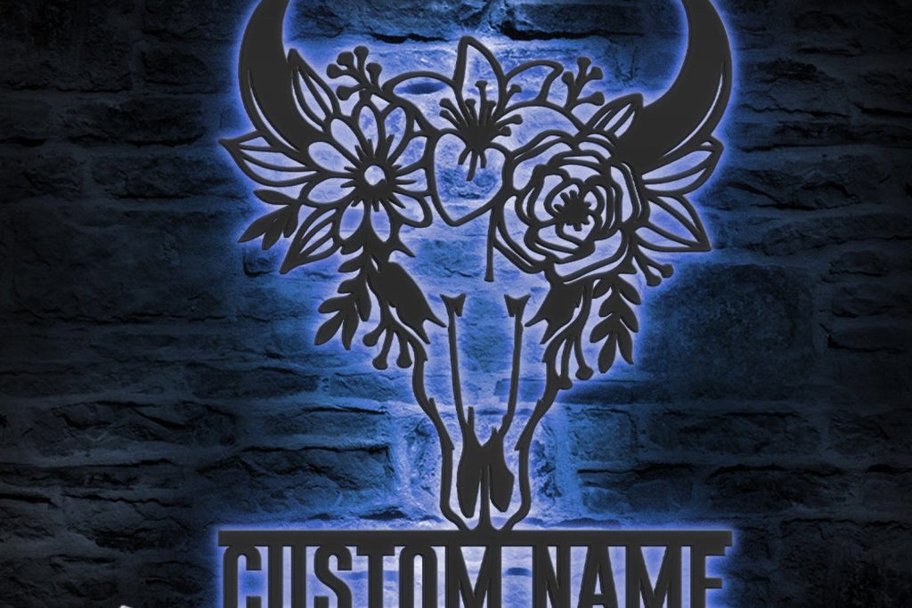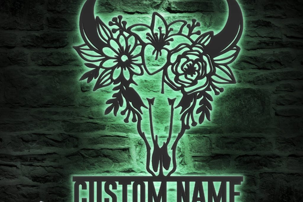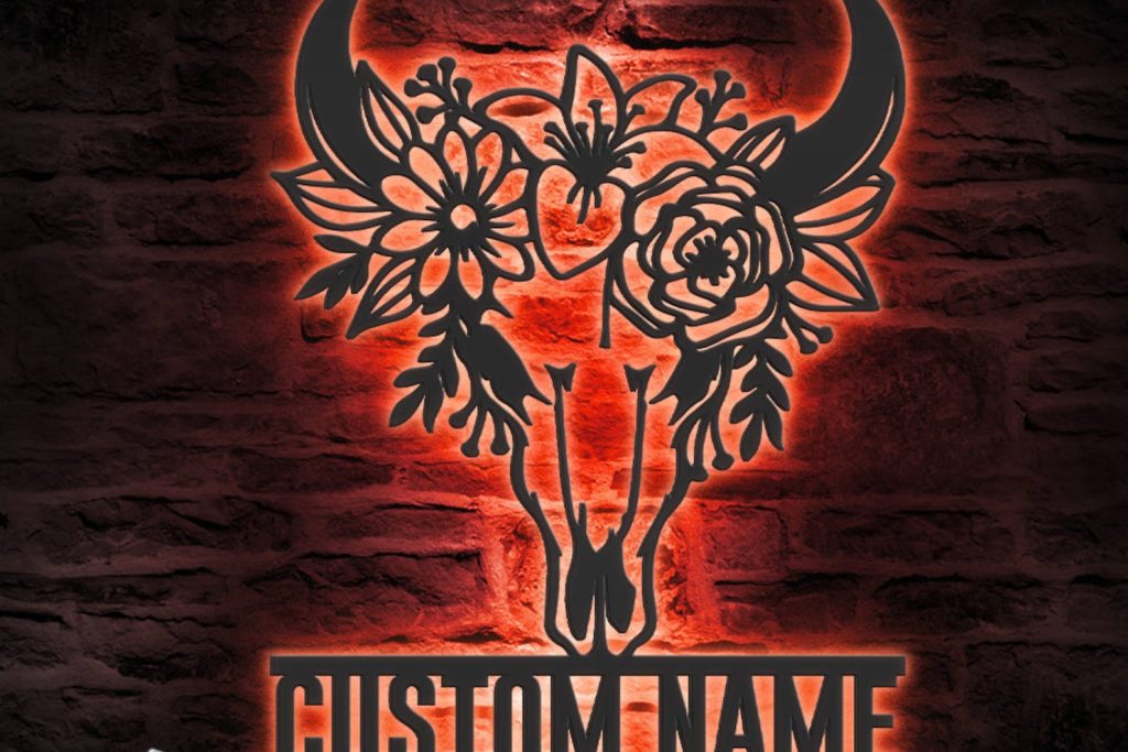 Custom Floral Cow Skull LED Metal Art – Personalized Boho Decor