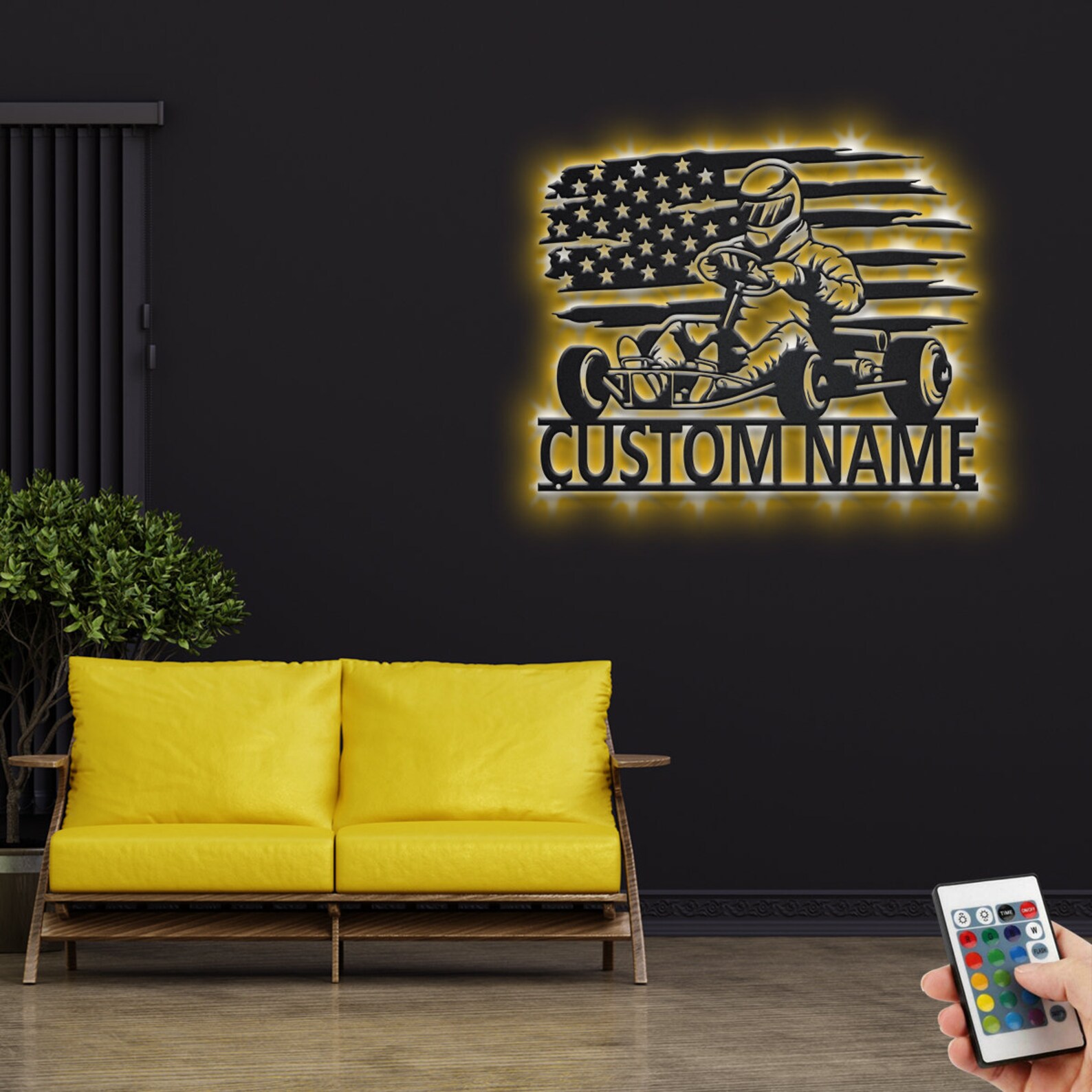 Custom Go Kart Metal Wall Art with LED Light, Personalized Name Sign