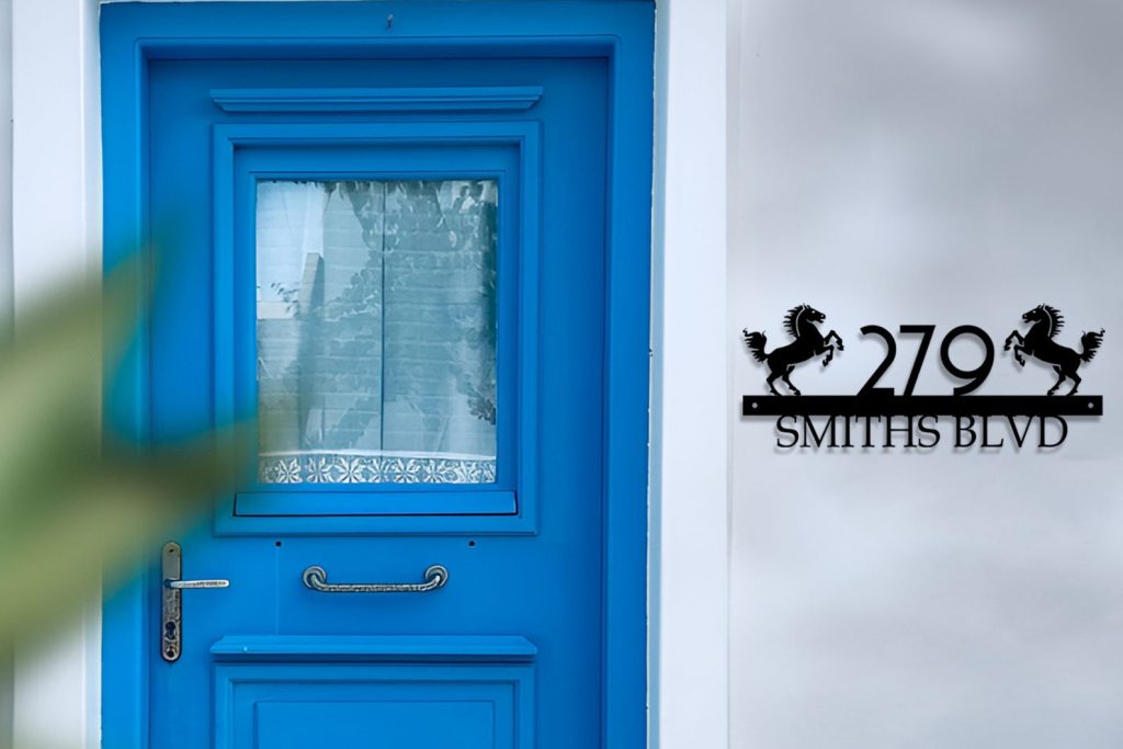 Be the first to review “Custom Horse Ranch Metal Address Sign – Mid-Century Decor”