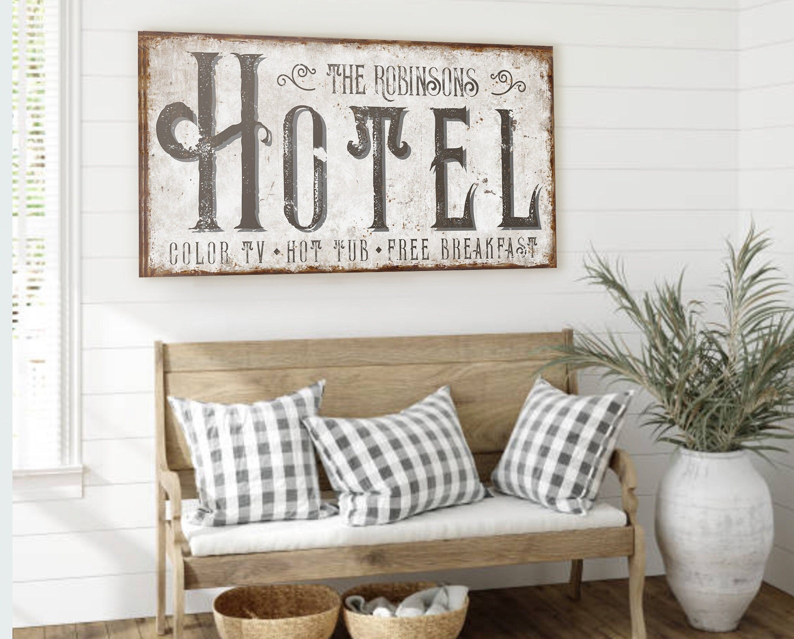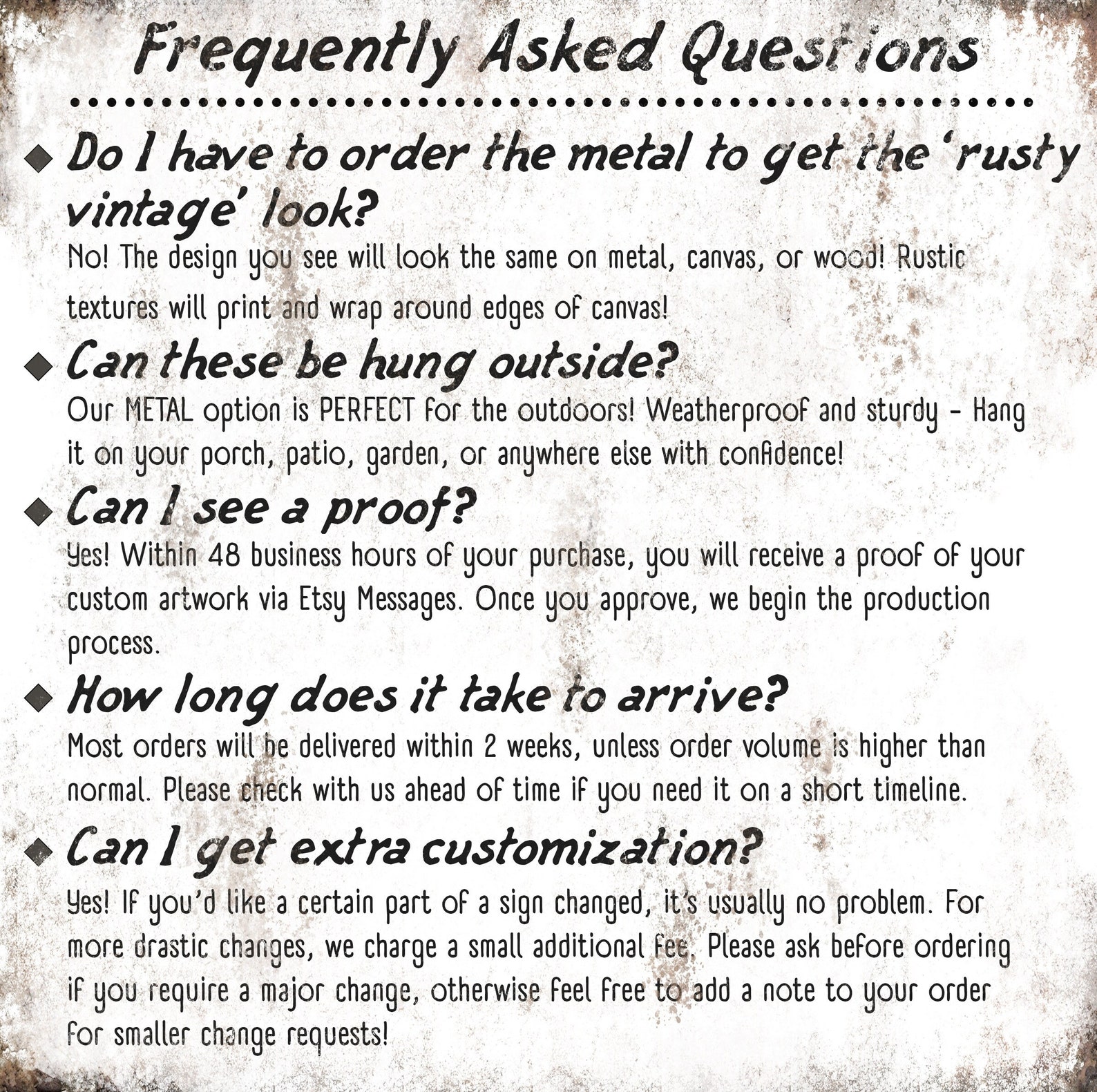 The rustic and weathered textures you see in the artwork will look the same no matter what item you order on. That means metal, wood, and canvas all have the vintage look to them!