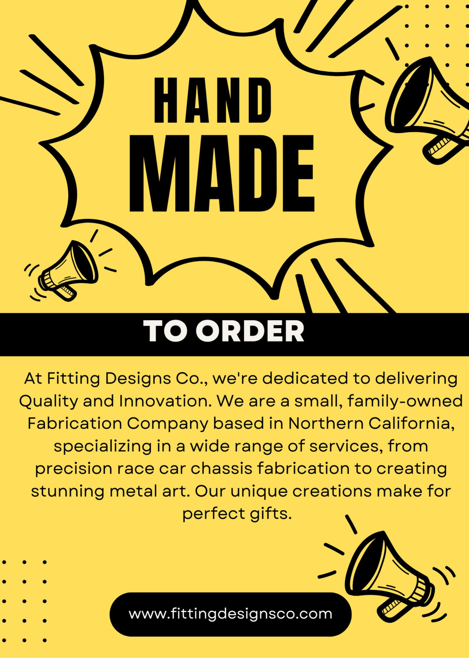 At Fitting Designs Co., we9;re dedicated to delivering Quality and Innovation. We are a small, family-owned Fabrication Company based in Northern California, specializing in a wide range of services, from precision race car chassis fabrication to creating stunning metal art. Our unique creations make for perfect gifts.