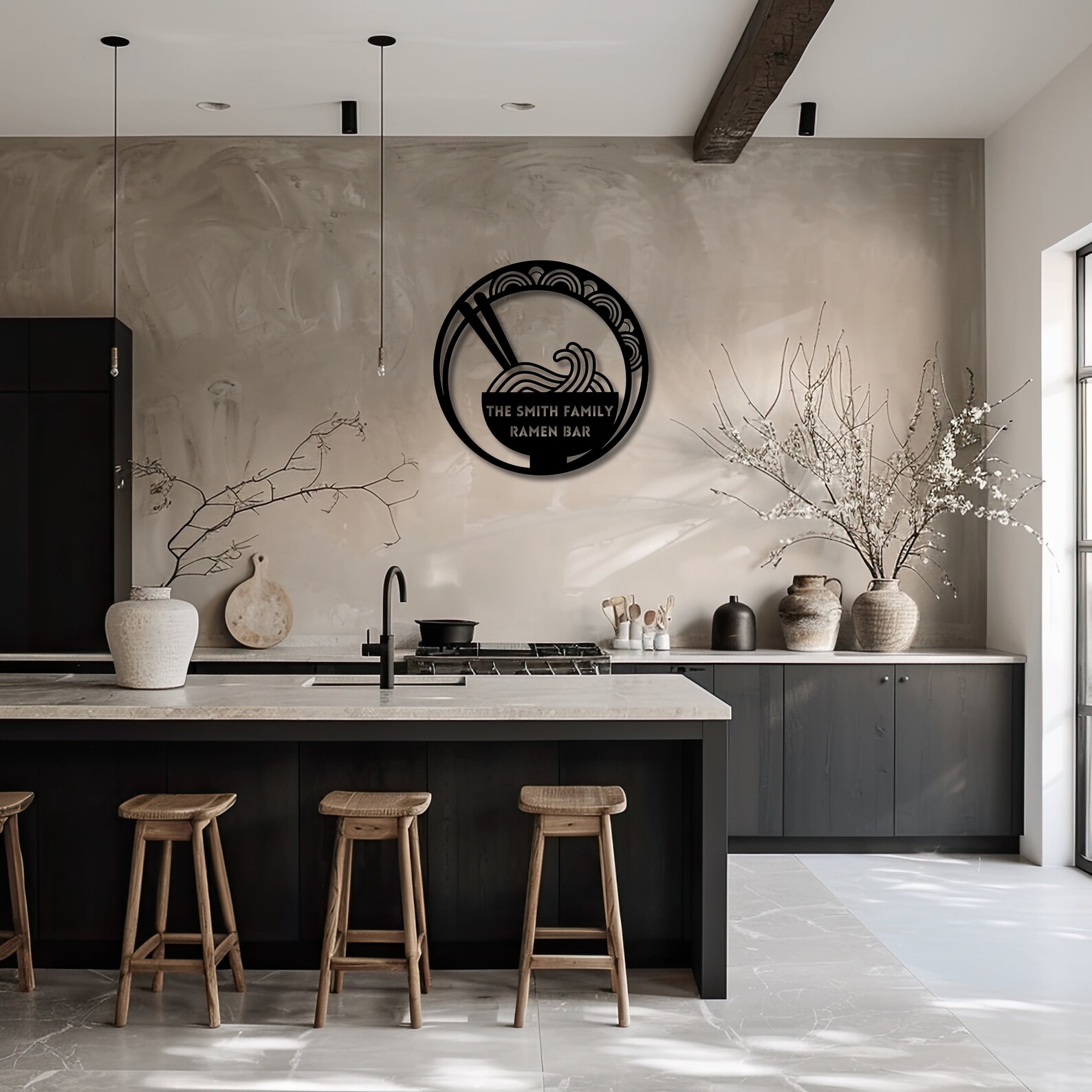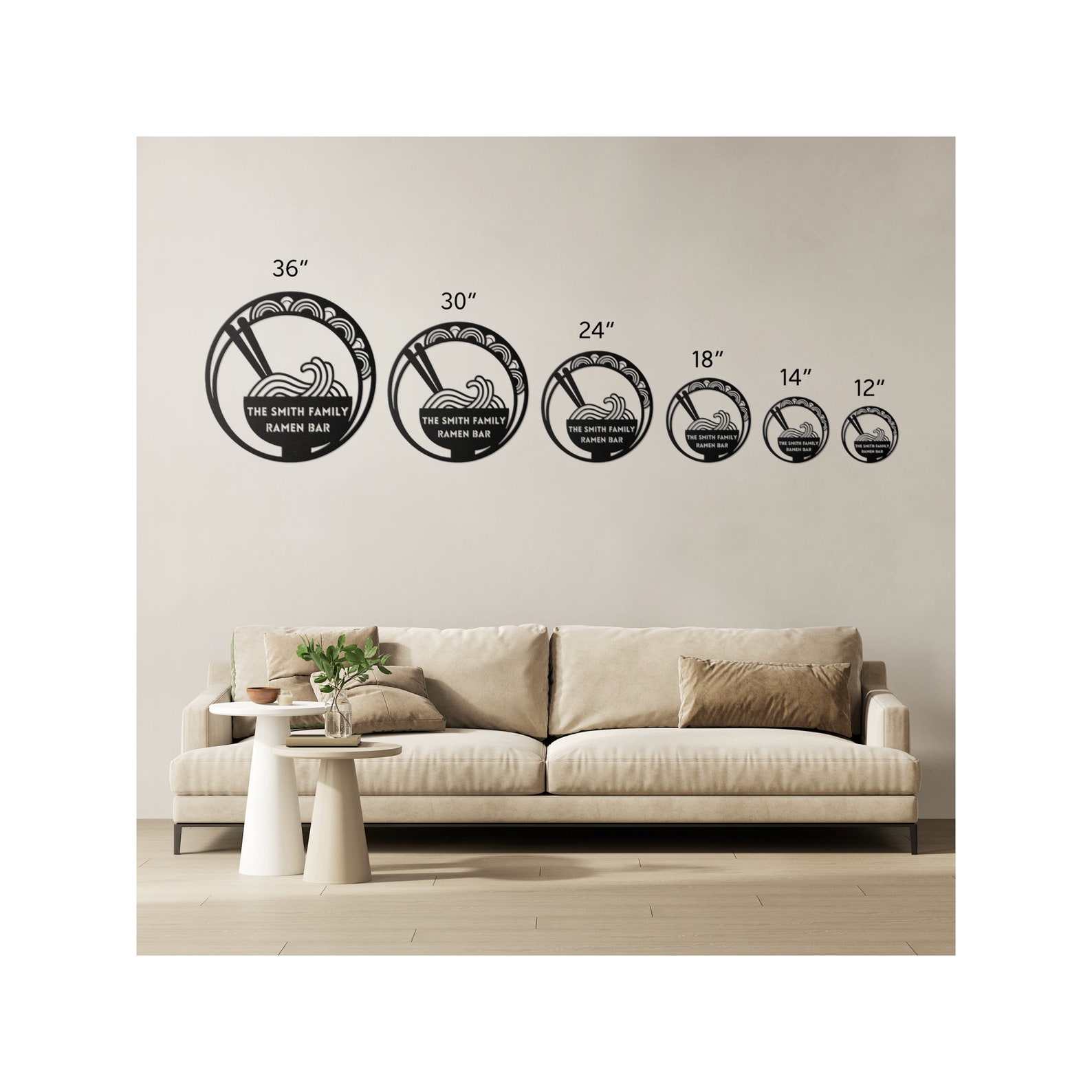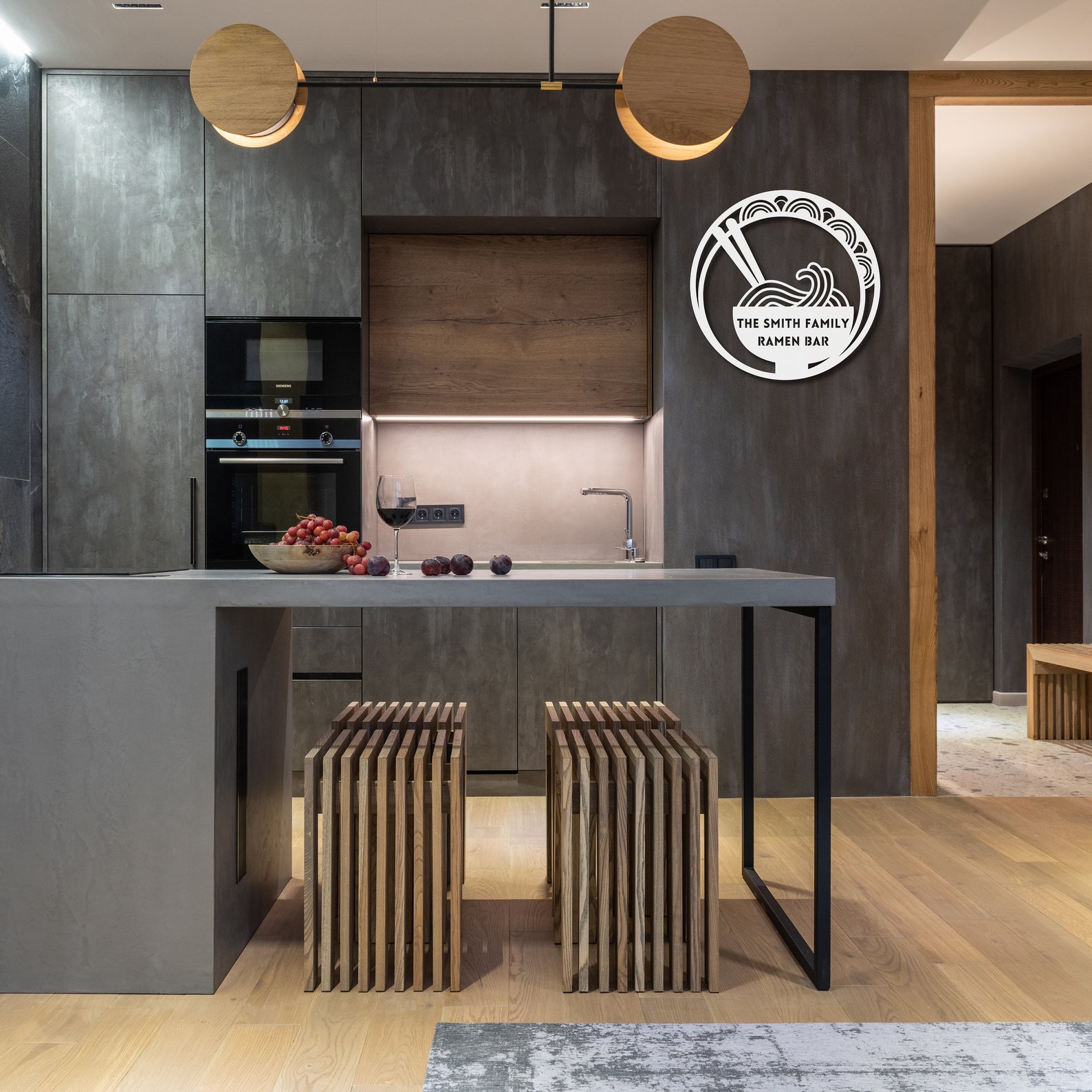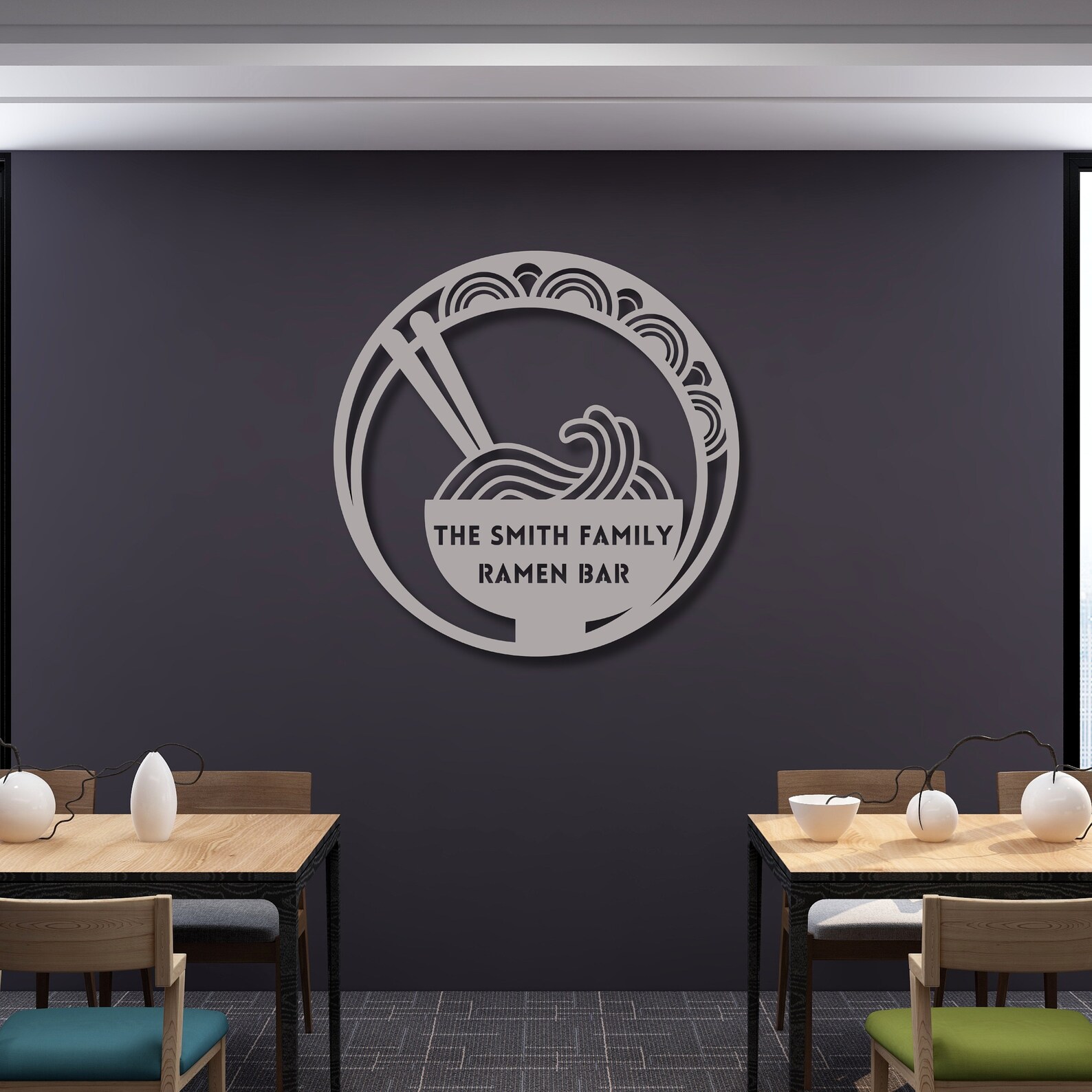Immerse yourself in the allure of a steaming ramen bowl adorned with elegant chopsticks, nestled amidst swirling noodles within a contemporary circle-in-circle motif. Personalize it with your family name, transforming your space into the "[your name] Family Ramen Bar," a haven where exquisite taste meets personalized refinement.