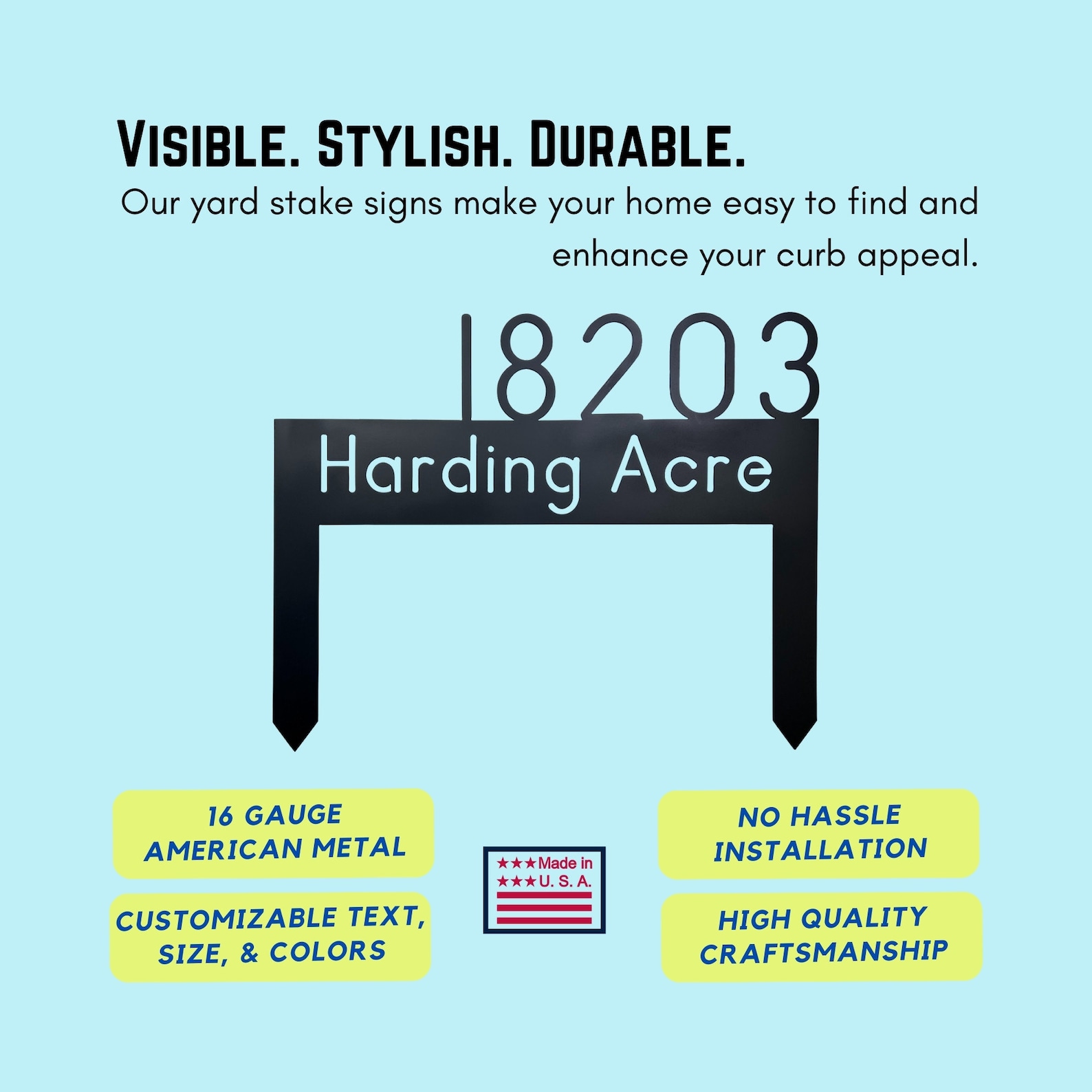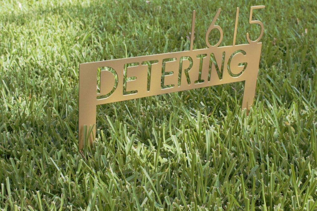 This custom lawn address sign is made out of high quality 16 gauge, locally sourced metal, and comes with integrated stakes for easy insertion in your yard!