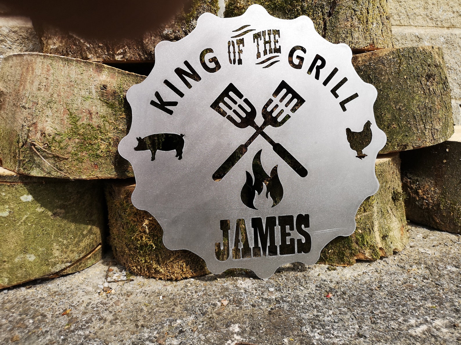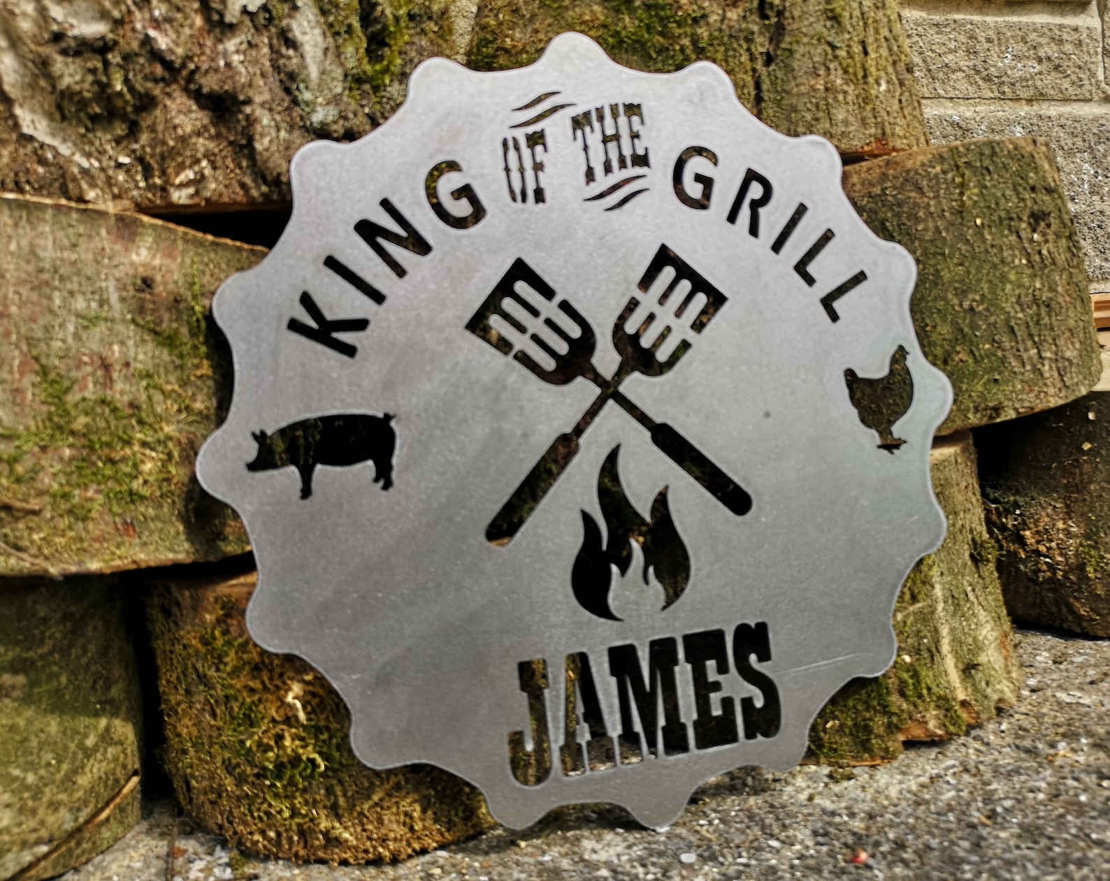 Awesome BBQ sign customized to the Kings name at the bottom. Tell the world that your the BBQ king! We can supply with, or without invisible stud mounting hardware or a simple hook on the rear.