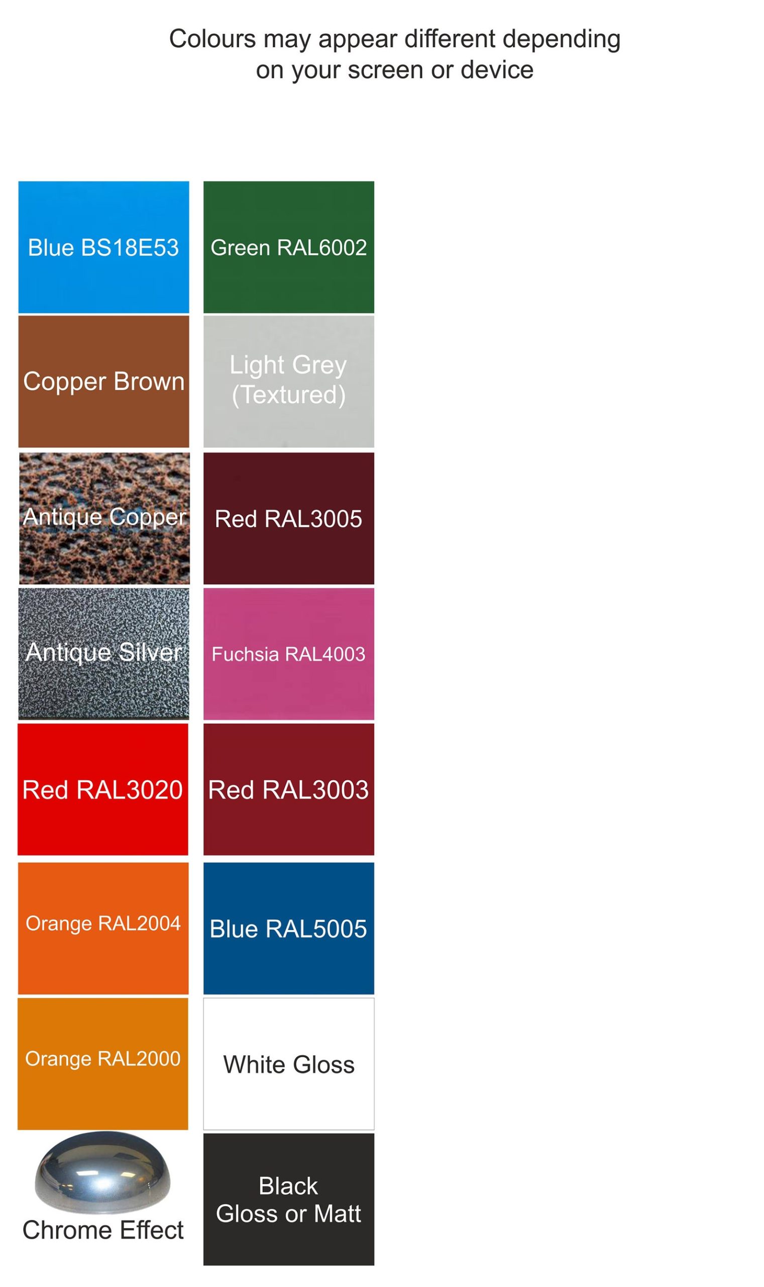 Item pictured is plain steel however we have many powder coating options for a tough long lasting finish. NOT STOCK THE COLOUR YOU WANT? then please get in touch, we have access to the whole spectrum of colours even with textured finishes