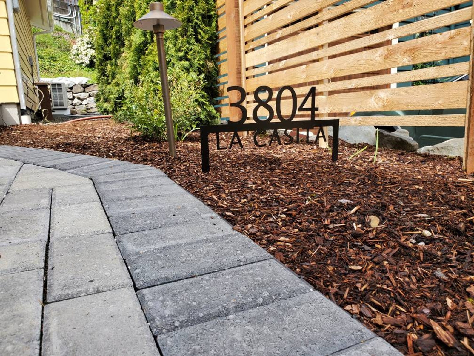 Custom metal personalized address sign/house numbers yard stake sign. Finished with highly durable exterior matte black powder coating. This address sign is made out of highly quality durable/sturdy 1/8 inch thick steel(12gauge). This gives the item a very sturdy feel. Item comes as shown in listing photos numbers and text is centered. Size is 15.5 inch tall by 22 inch wide.