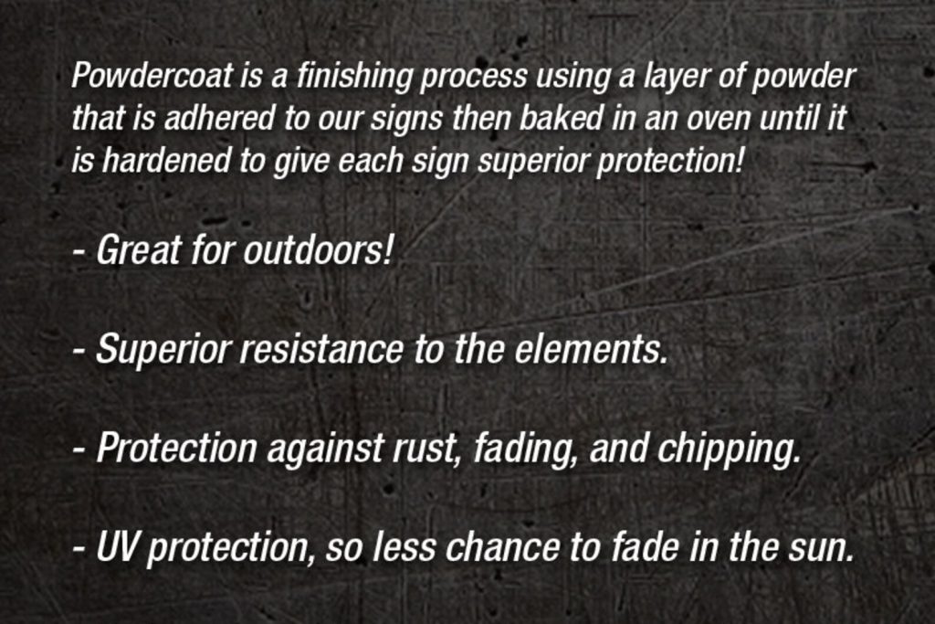 – Clear: Gives a more industrial look to the sign. Dark gray in color with markings such as patina, scratches, or grind marks from the cleaning process that are unique to each metal sign. The steel is then painted with a clear coat to help protect it from rusting.