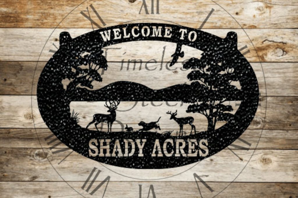 An oval metal sign. Featuring forest animals and a fun-loving beagle chasing a rabbit. There is a mountainous lake in the background. This stylish piece will showcase your outdoor lifestyle. Show off your love for pets for generations. Choose from a variety of colorful powder coat finishes. The finish prevents rust and maintains a beautiful finish for years.