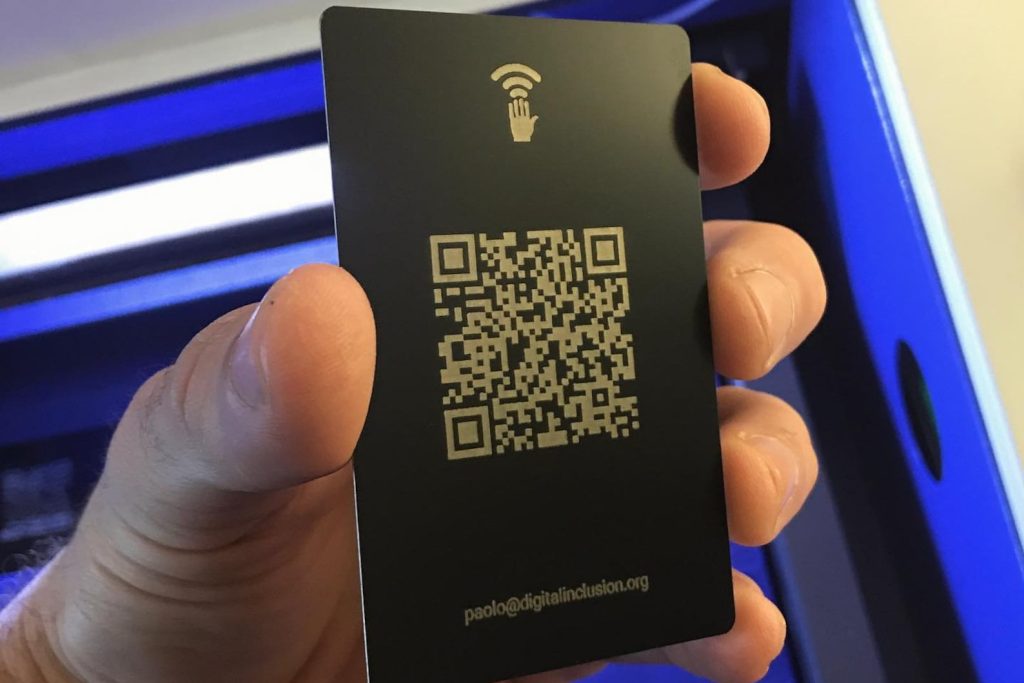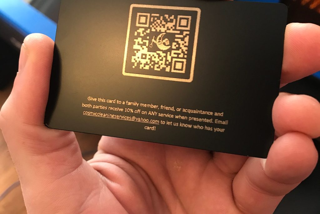 These metal QR codes make a lasting impression. The cards are made from anodized aluminum and will not patina or rust. The front and back both have a uniform matte black finish. The cards are lightly sanded to remove any burrs or sharp edges & are a sturdy uniform thickness, making a great business card or metal keepsake. I have made groomsman gifts, wedding gifts, event ticketing, restaurant QR code menus, band merchandise and more with these cards. Unlike paint or enamel, these have undergone a anodizing treatment process for their color, so they do not scratch as easily and hold up well to wear and tear.