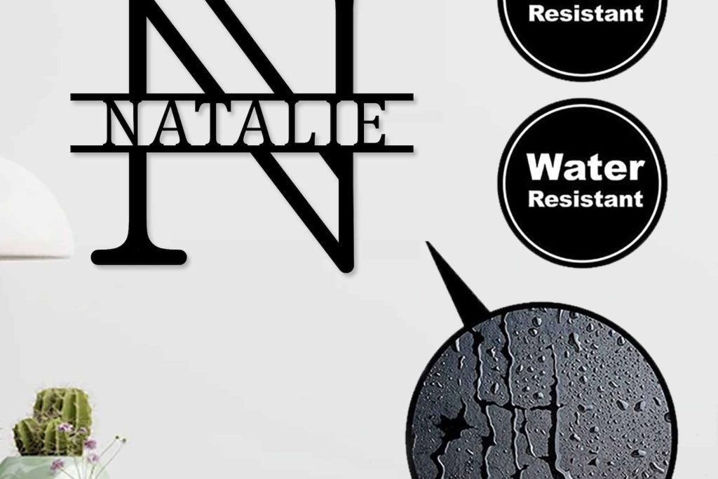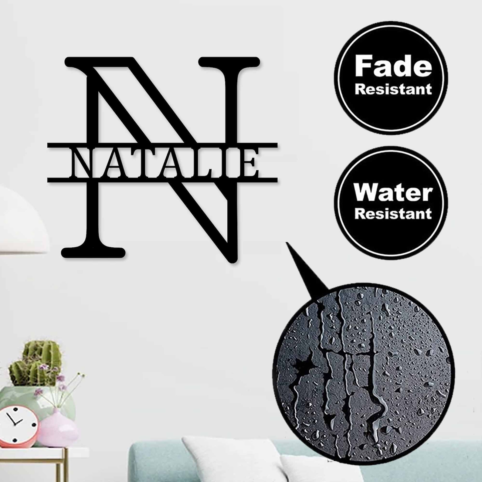 Customize your metal sign with the name, last name, initial letter and bottom text, and add information to the text box.