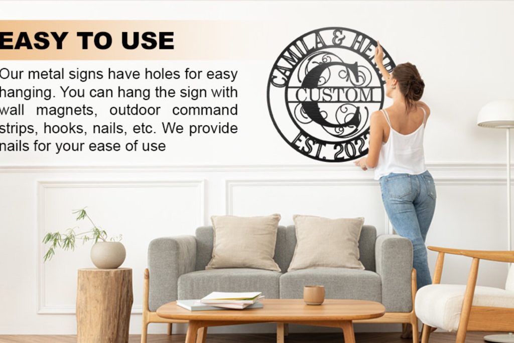 asy to hang — You will receive a name sign with nails and screws. There are holes for you to hang metal signs. You just need to find a suitable place and position it with a hammer. The design of two or more holes can make the name sign more stable, dont worry about it falling or something. The nut can hide the screw without affecting its beauty.