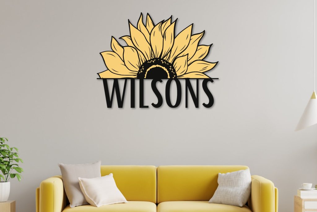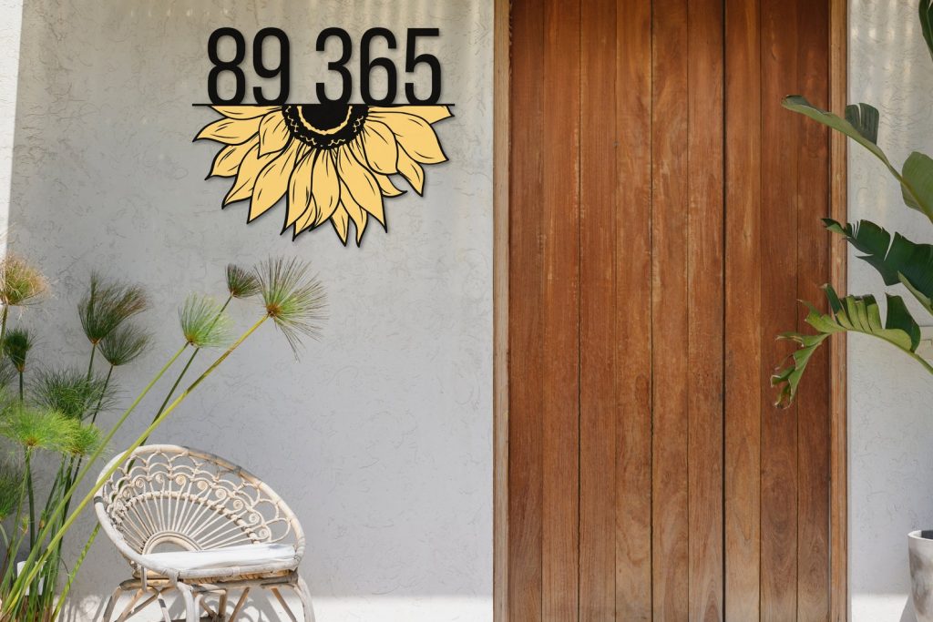 Personalization Options: Make this sign uniquely yours by choosing your preferred names, text, and house numbers. Customize the placement of the split sunflower design to suit your style.