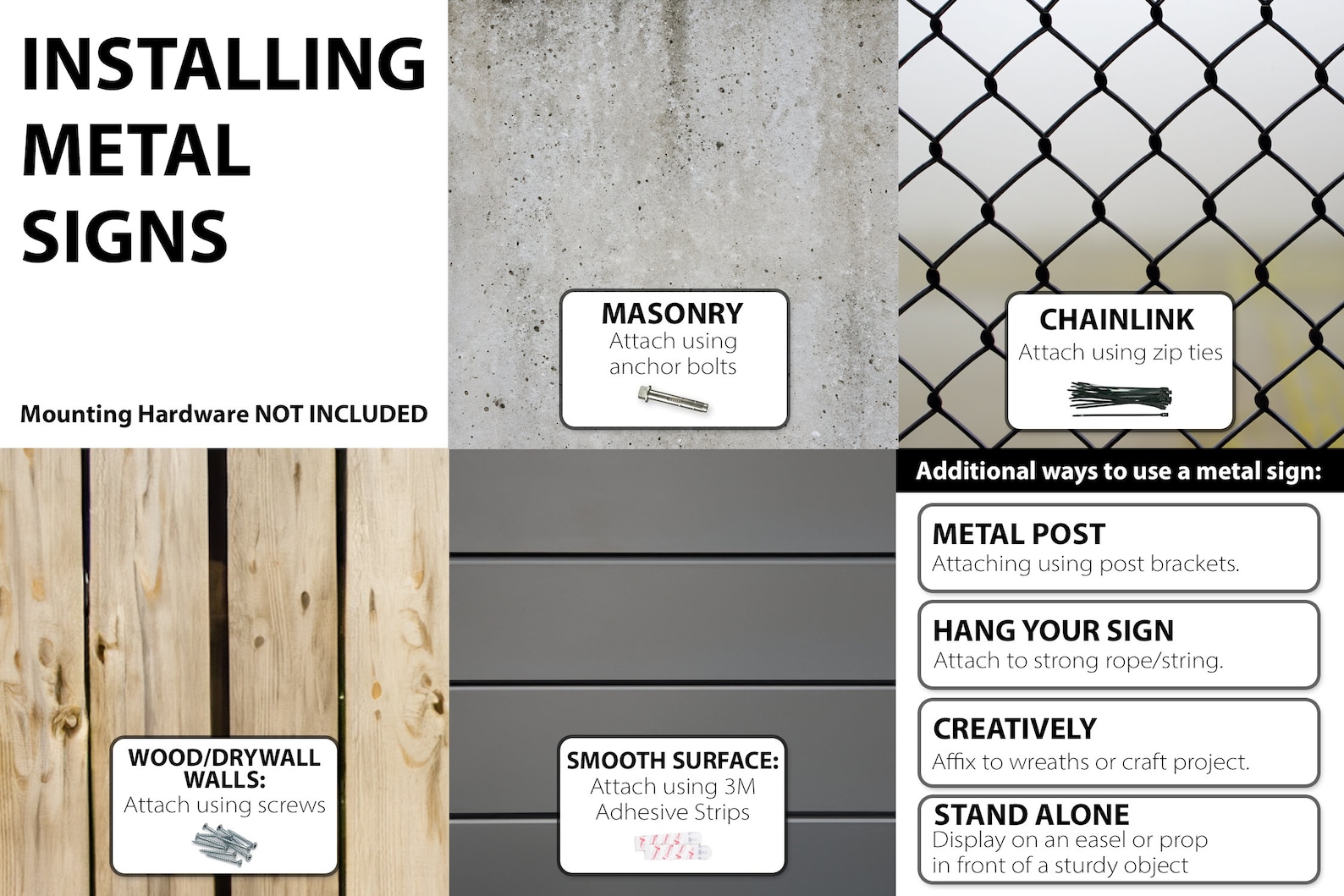 Pre-drilled holes: Hang using zip ties, screws, nuts & washers, sign brackets, rope, etc. Holes will be drilled in all corners unless otherwise specified.