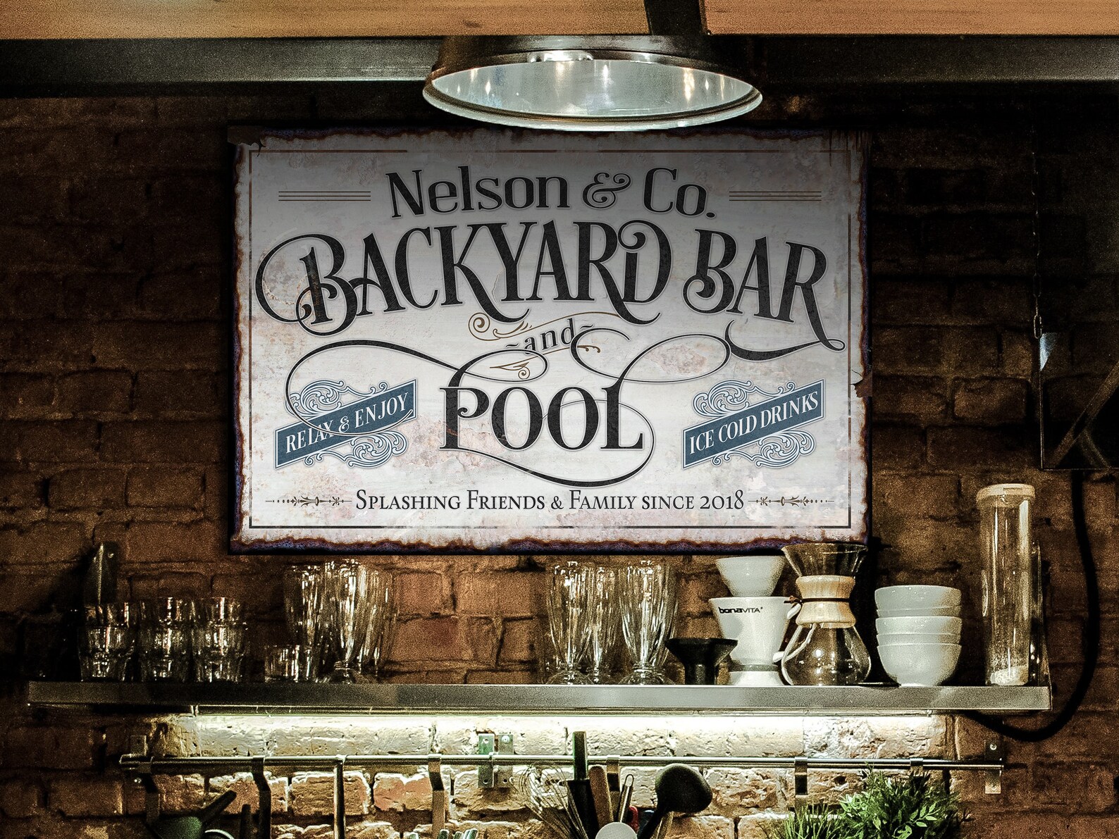 This personalized backyard pool bar sign is the lighter version I created (see darker version in shop). It offers a vintage, pub decor look and feel. I will customize your backyard pool bar sign by integrating your name and established date into the vintage art you see. Display this vintage, bar sign on your porch, patio, deck or by the pool. It adds warmth to any wall and of course, any game room or wet bar area. Consider this bar sign as a great gift for him or gift for dad.