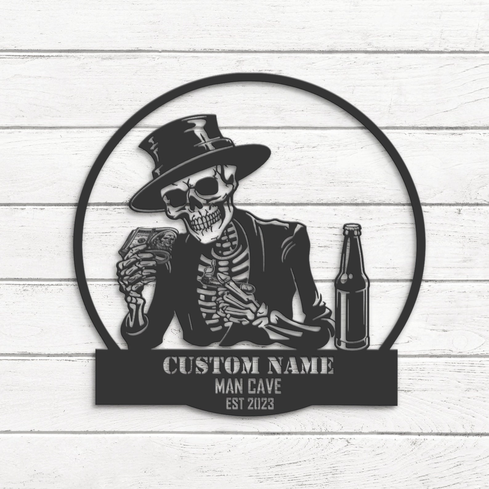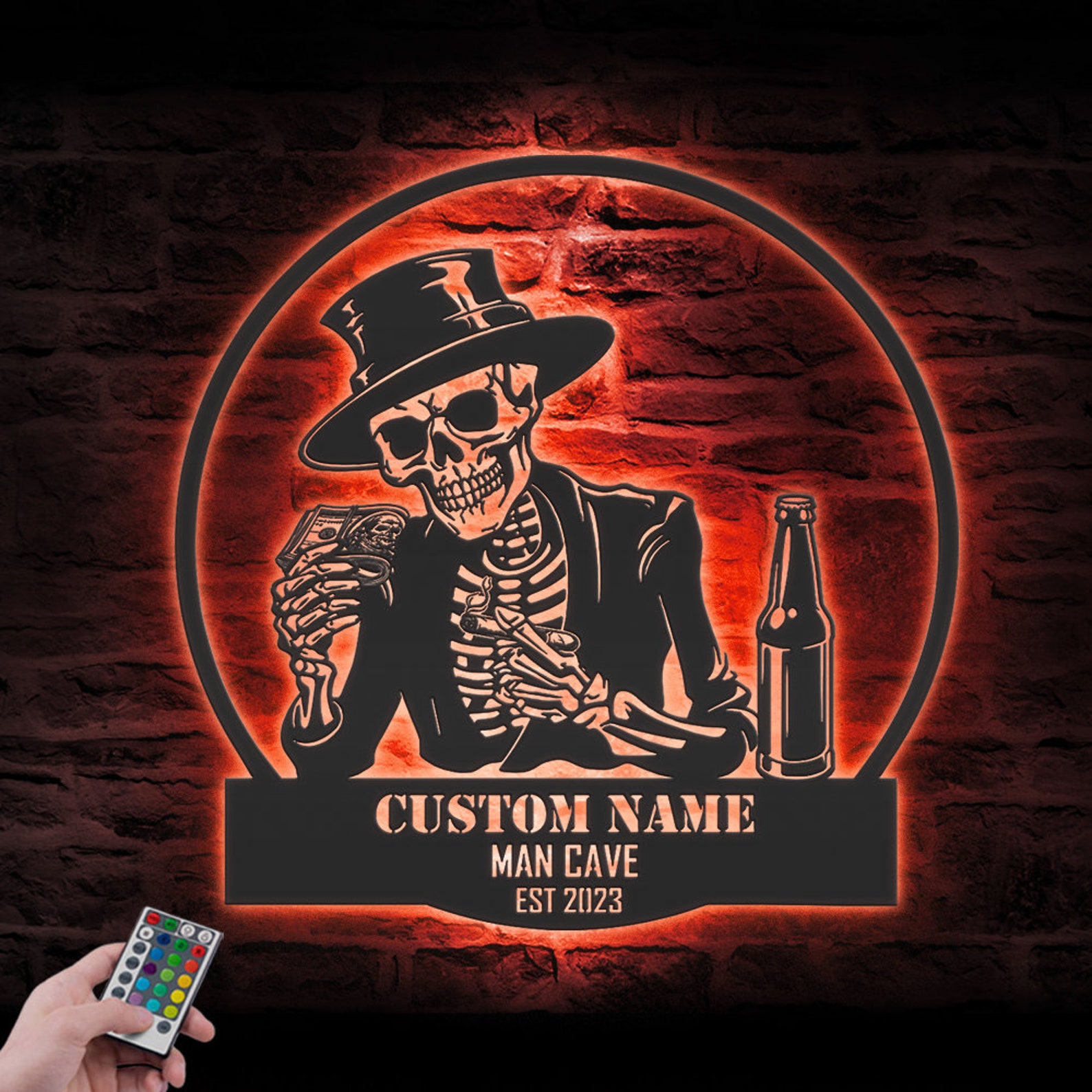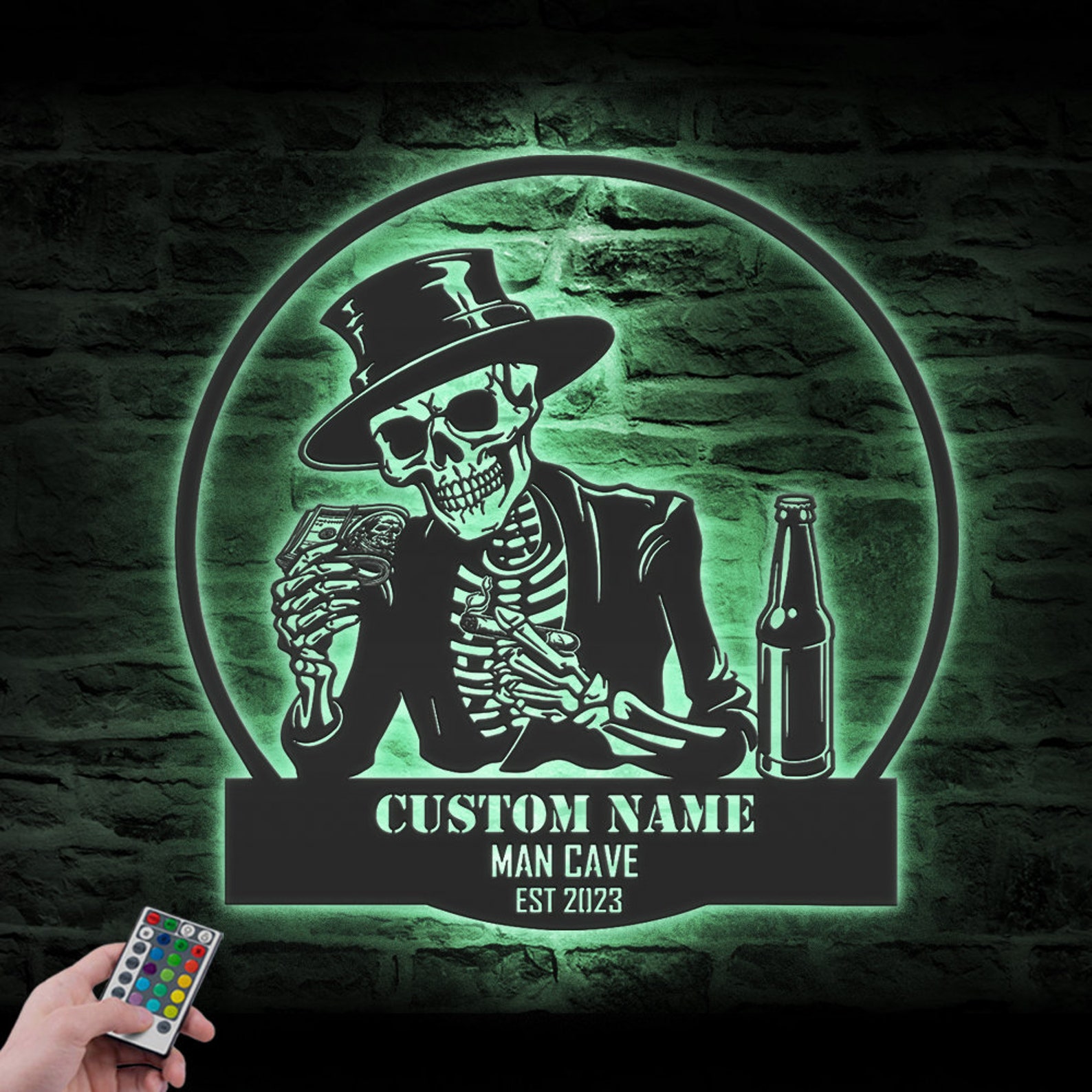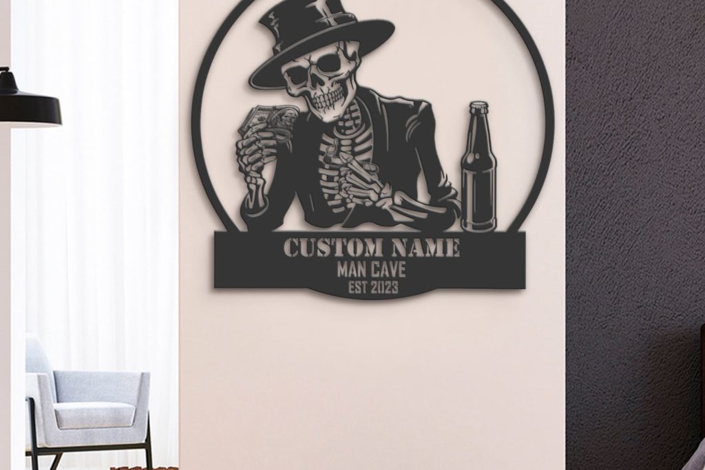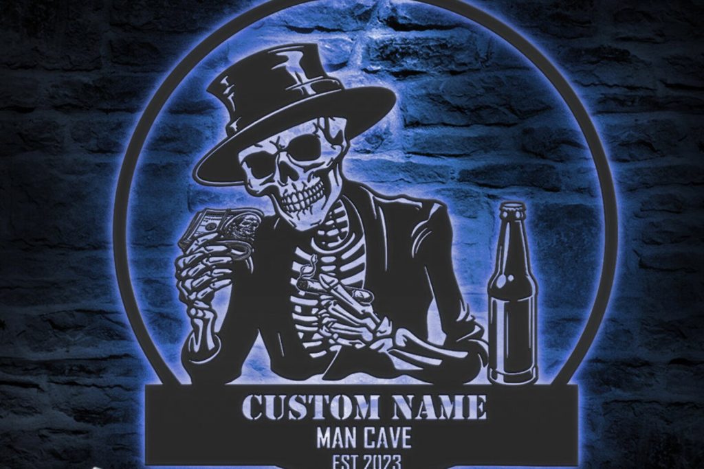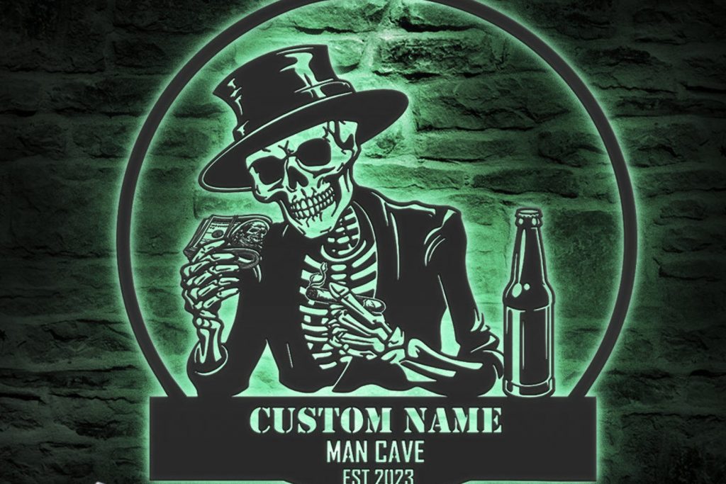 Custom Skeleton Beer Cigar Dollars Metal Wall Art – LED Light, Personalized Sign